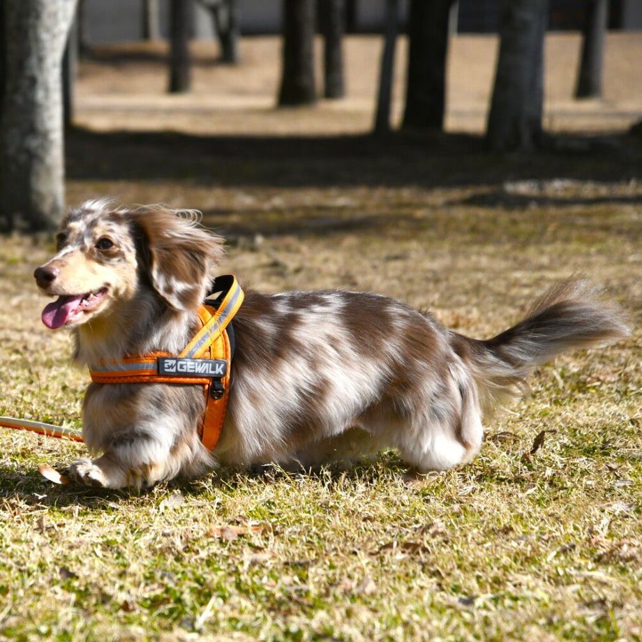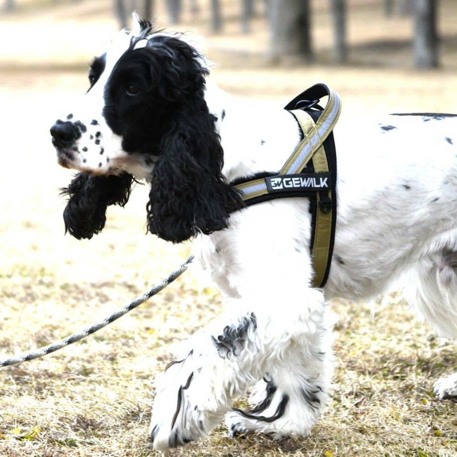 T型ハーネスは、頭からかぶせて足をあげずに簡単に着脱させることができます。
