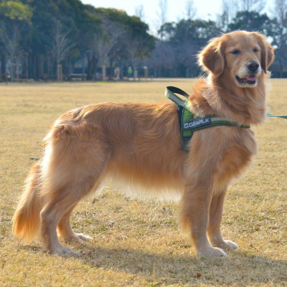 T型ハーネスは、頭からかぶせて足をあげずに簡単に着脱させることができます。