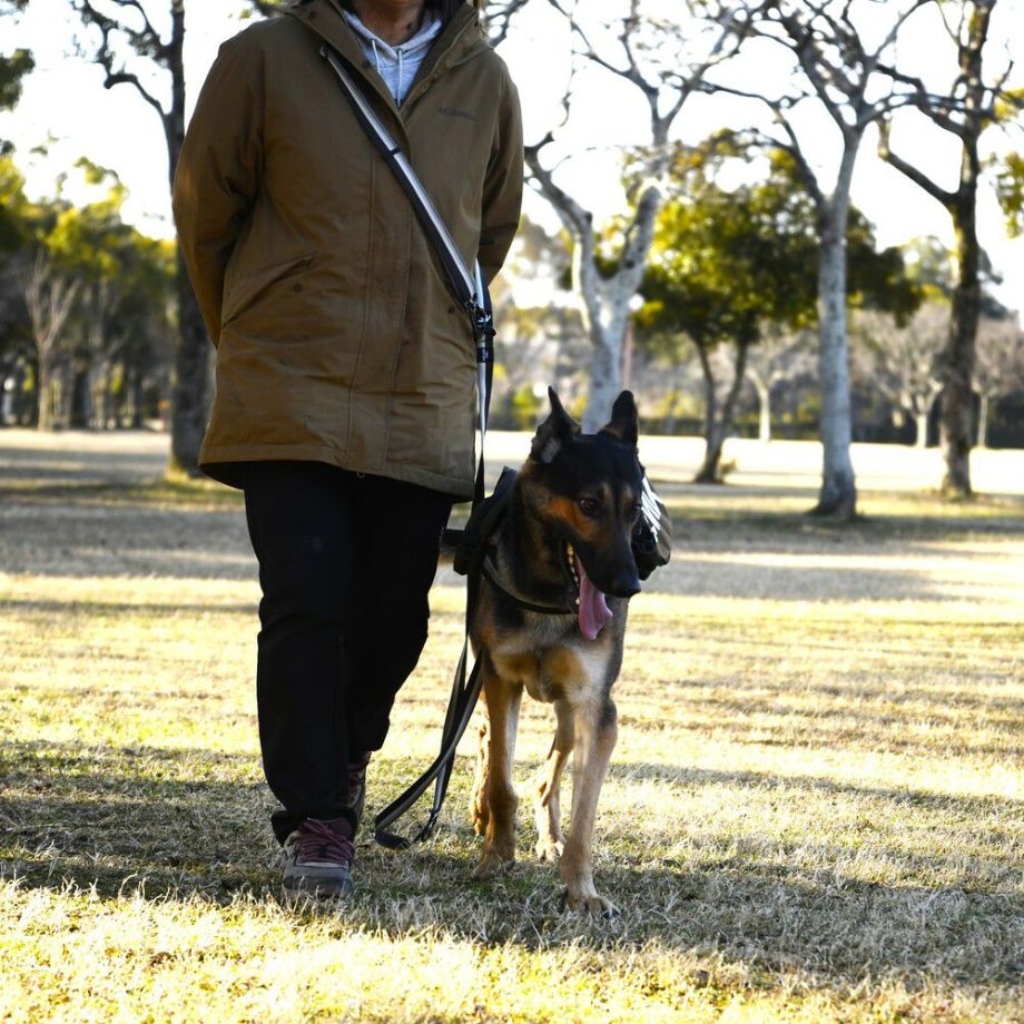 肩に斜め掛けにして使用することでハンズフリーとなり、安全性の高いロック機能付き軽量カラビナスイベルを採用しているのでリードがねじれにくく快適に散歩が可能です。
