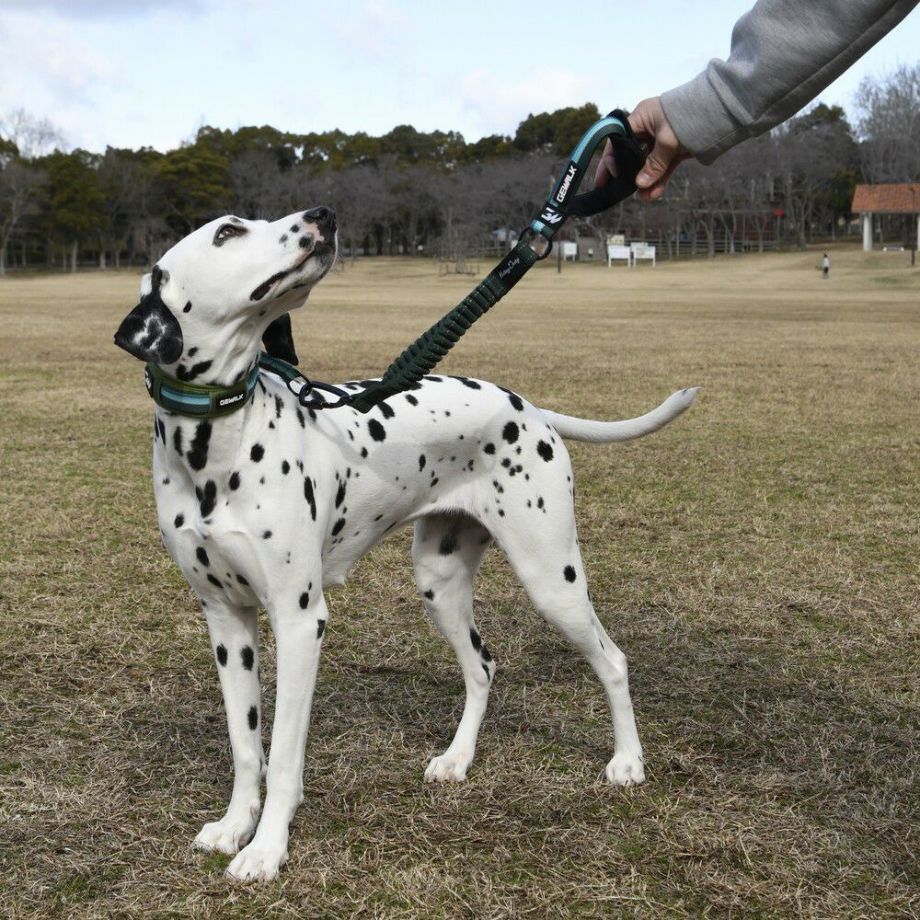 また、ツインパワーコードにより力強い引っ張りにもショックを吸収し、飼い主様とワンちゃんの負担を軽減します。ショートグリップの為、操作性も良く再帰性反射ステッチを使用しており、夜道でもライトに反射し安心・安全です。