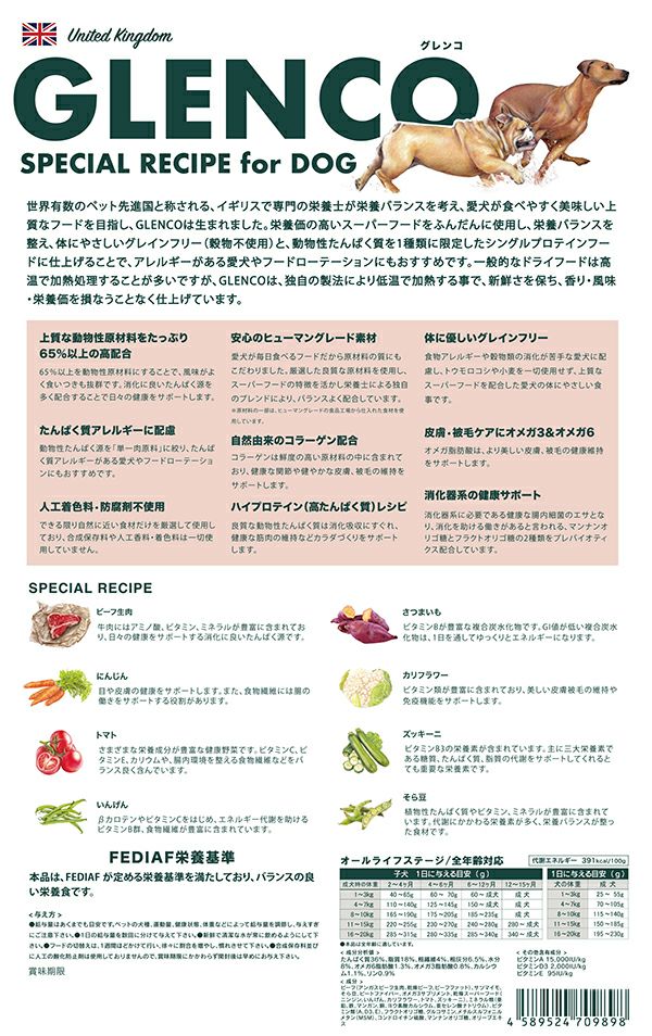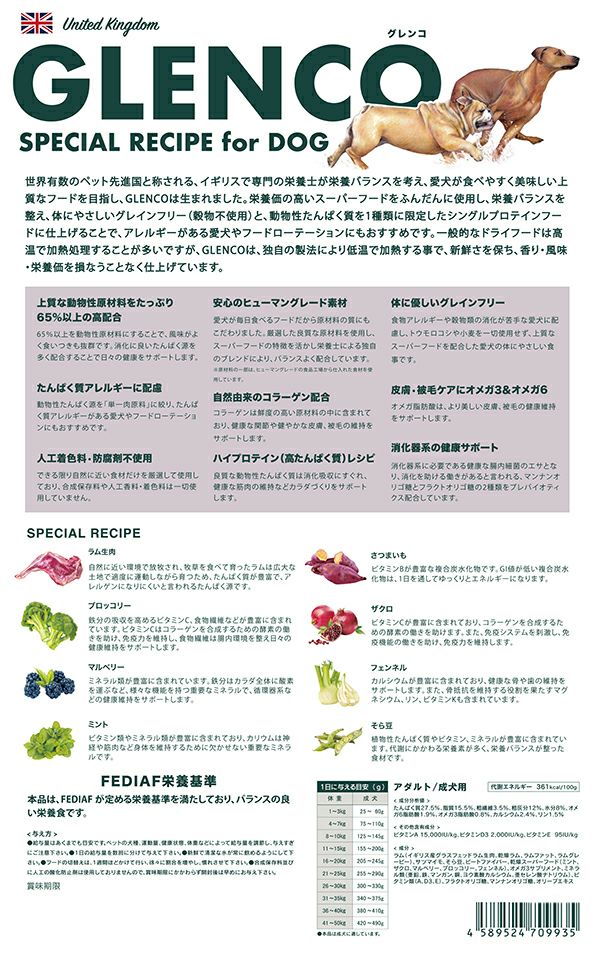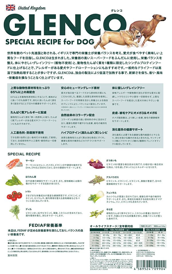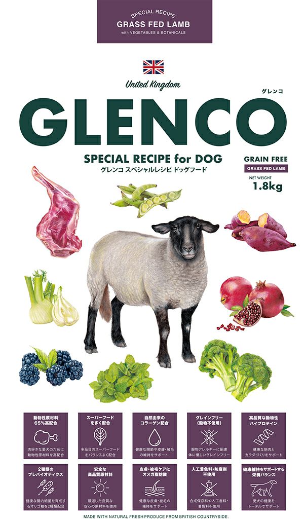 世界有数のペット先進国と称される、イギリスで専門の栄養士が栄養バランスを考え、愛犬が食べやすく美味しい上質なフードを目指し、GLENCOは生まれました。