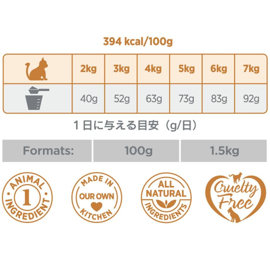 鶏肉を使用し、高タンパク質・低脂質・ローグレインの、生後12か月以上の成猫向けの上質なフードです。