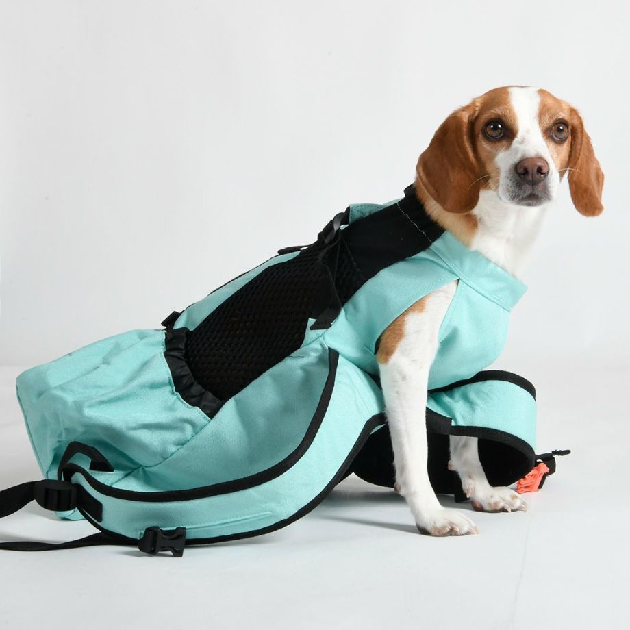 災害時、瓦礫やガラスの破片で愛犬が地面を歩く事が出来ない場合は「K9スポーツサック」が役立ちます。