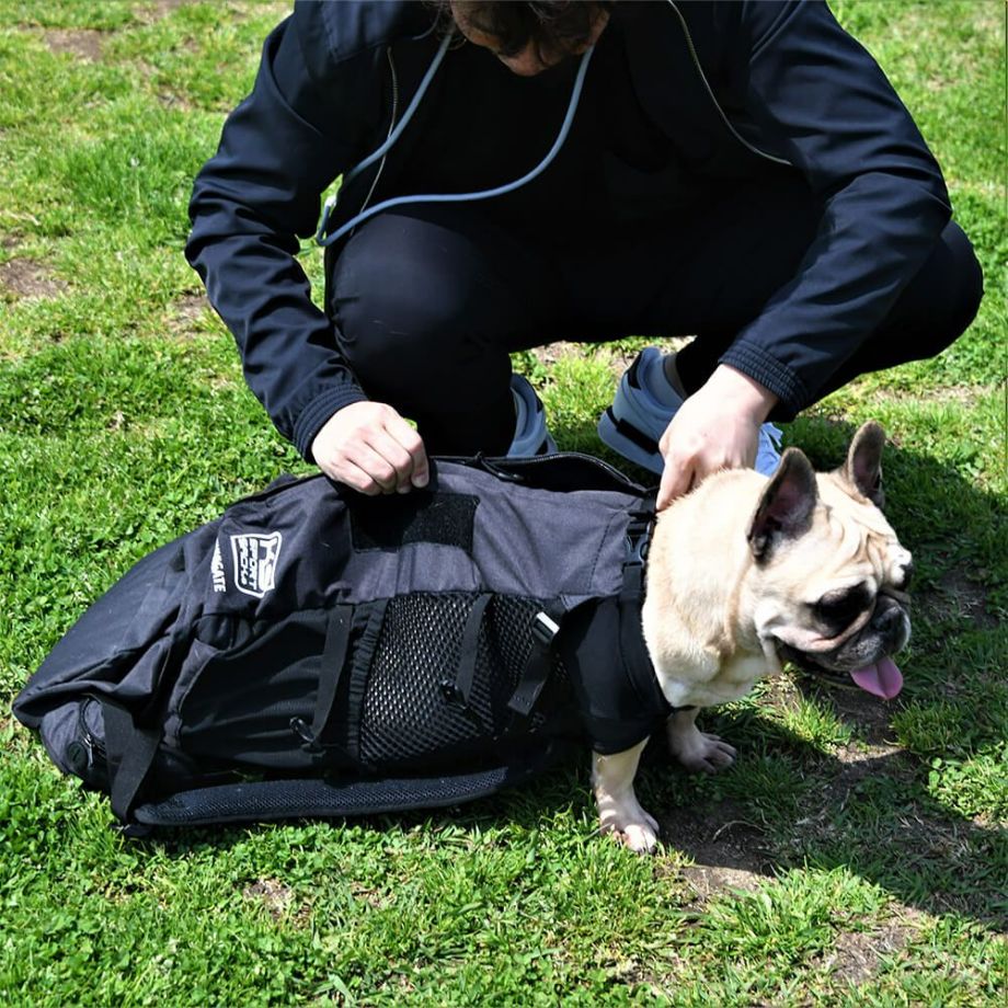 災害時、瓦礫やガラスの破片で愛犬が地面を歩く事が出来ない場合は「K9スポーツサック」が役立ちます。