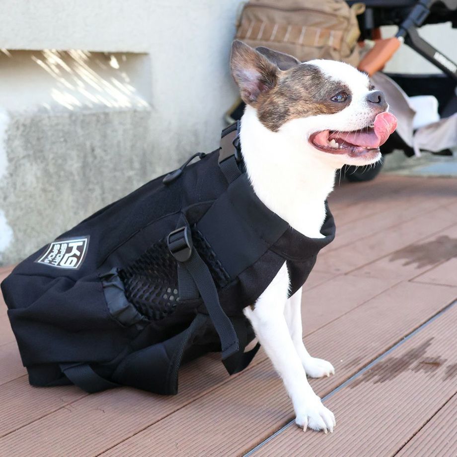 災害時、瓦礫やガラスの破片で愛犬が地面を歩く事が出来ない場合は「K9スポーツサック」が役立ちます。
