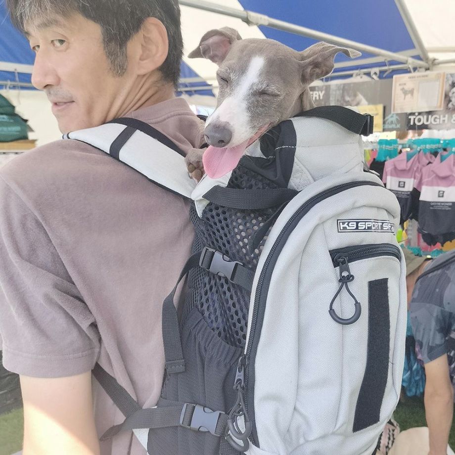 災害時、瓦礫やガラスの破片で愛犬が地面を歩く事が出来ない場合は「K9スポーツサック」が役立ちます。