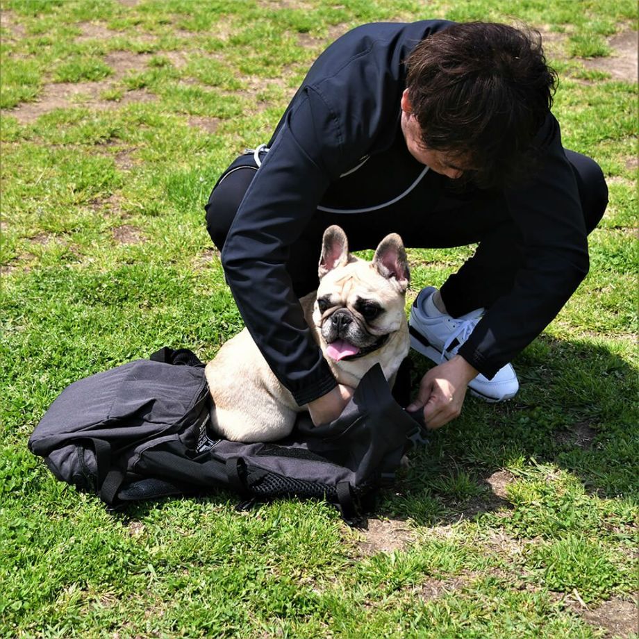 災害時、瓦礫やガラスの破片で愛犬が地面を歩く事が出来ない場合は「K9スポーツサック」が役立ちます。
