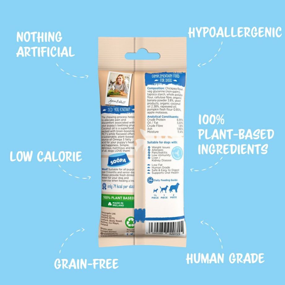 Soopaデンタルスティックは、噛むことが大好きな愛犬のための低刺激性の穀物不使用おやつです。