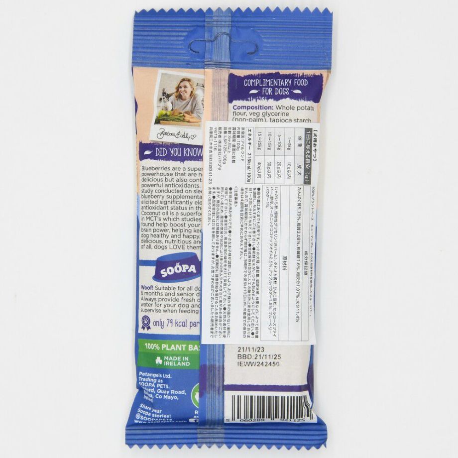 じゃがいも粉、植物性グリセリン(非パーム)、タピオカ澱粉、ひよこ豆粉、セルロースファイバー、酵母、オーガニックココナッツオイル2.5%、アップルパウダー1.5%、ブルーベリーパウダー1%