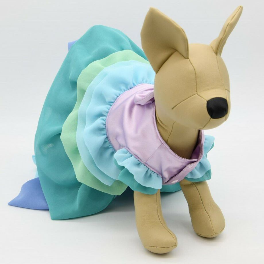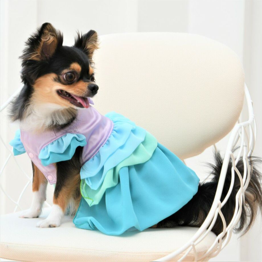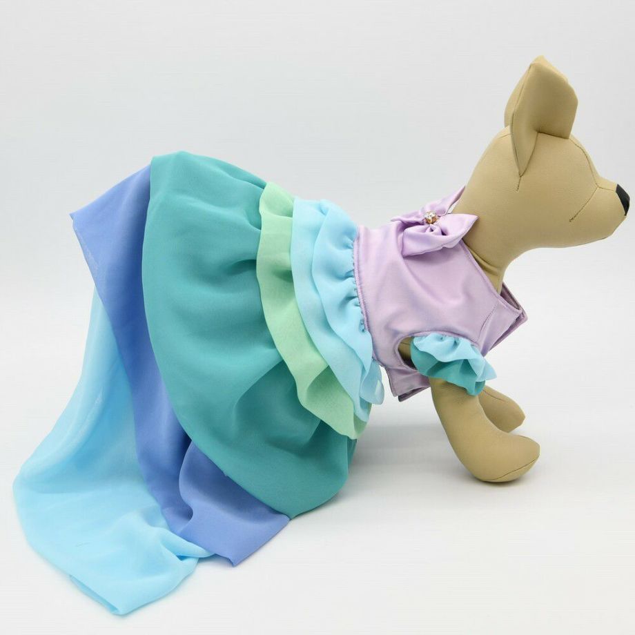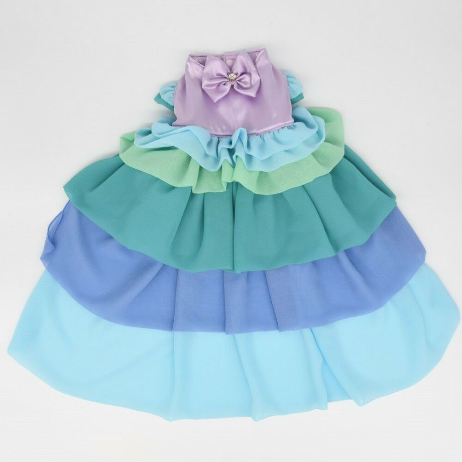 さわやかなフレッシュグリーン、ターコイズブルー、パープルなど色とりどりのシフォンをふんだんに使用したティアードドレス。