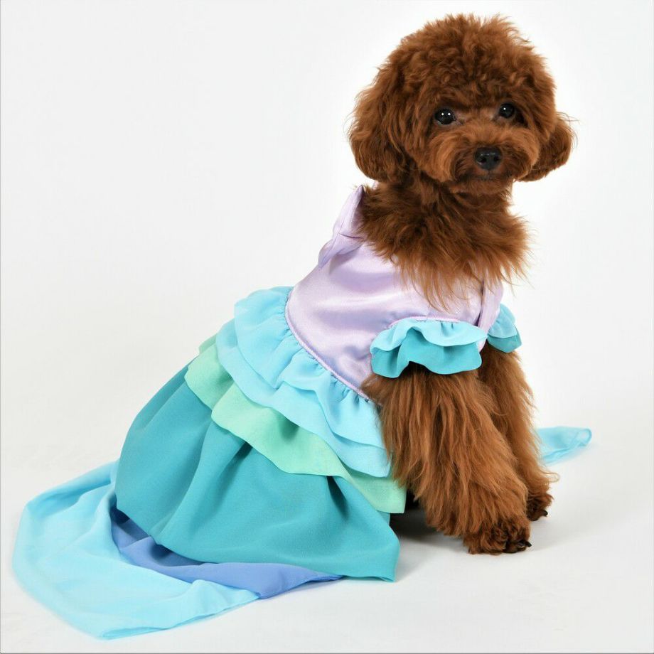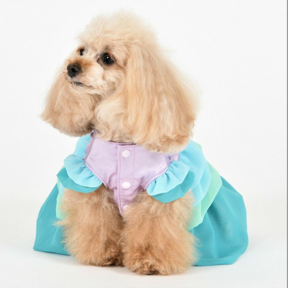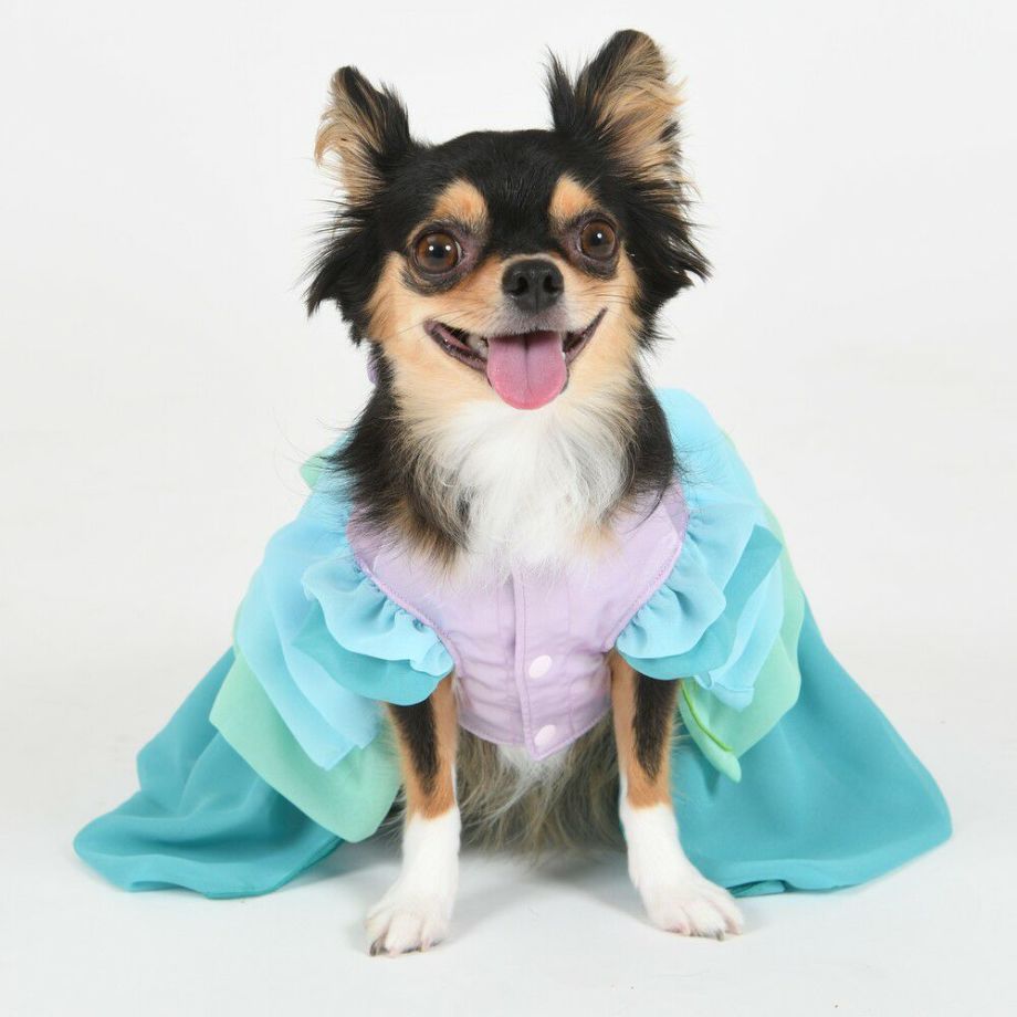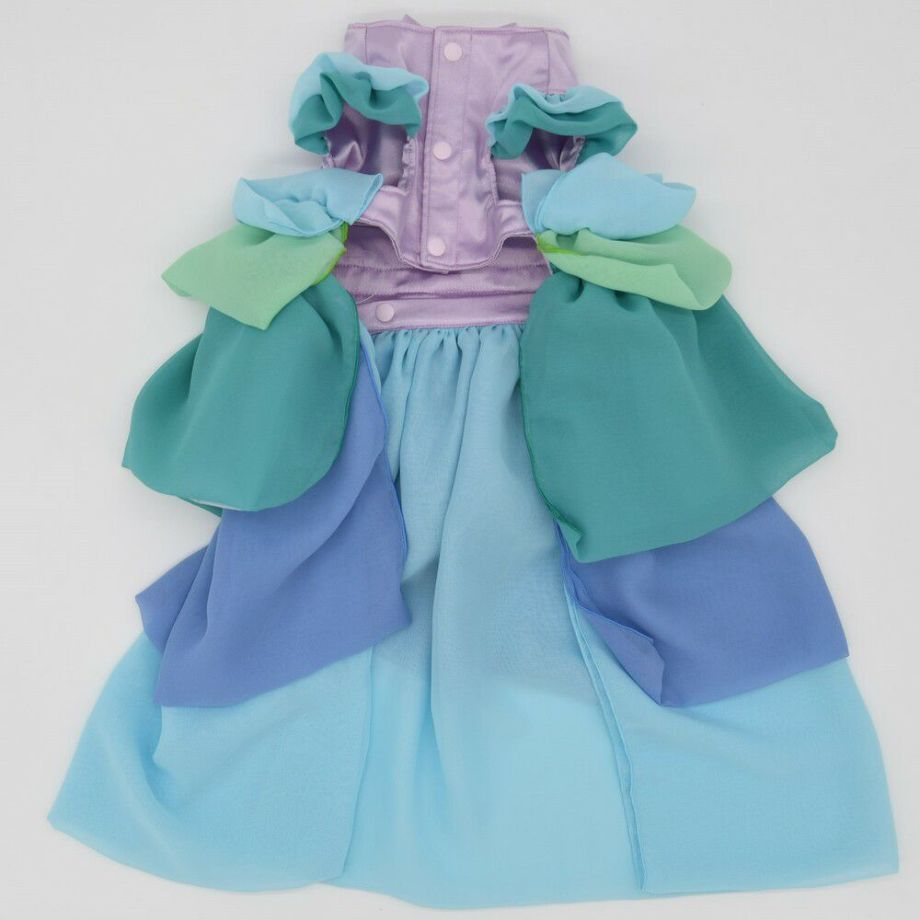 さわやかなフレッシュグリーン、ターコイズブルー、パープルなど色とりどりのシフォンをふんだんに使用したティアードドレス。