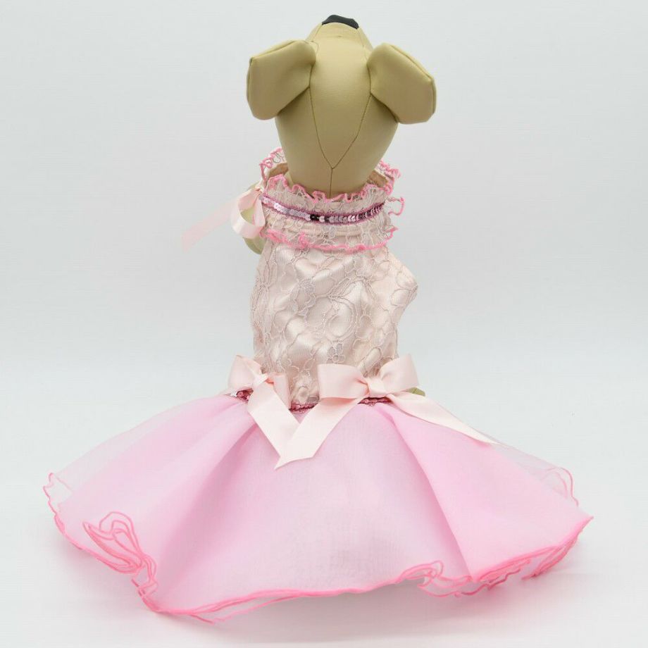 淡い上品なピンクで全体をまとめ、ホルターネックのデザインが着脱も簡単でお袖が苦手な子にもお勧めの、パーティーにぴったりのドレスです。