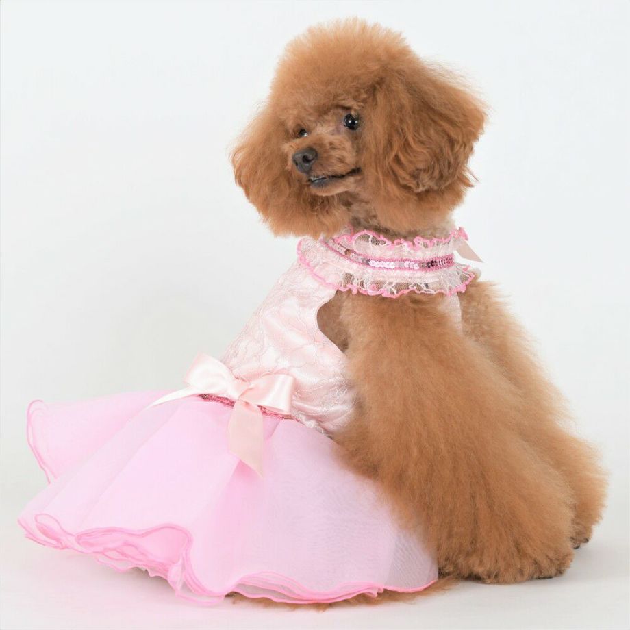 身頃には上質なラメ入りのコードレースを使用し高級感溢れます。襟元とウエストにピンクのスパンコールブレードを施し愛らしいアクセントになってます。