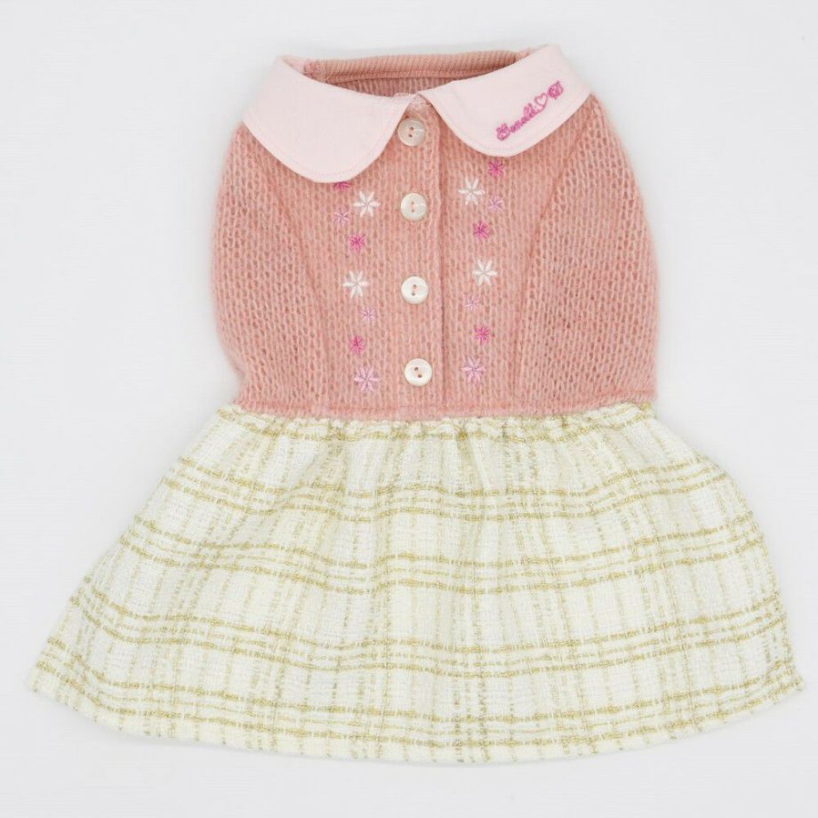 身頃に愛らしい花刺繍を施したニット素材のシャツワンピースデザインになります。