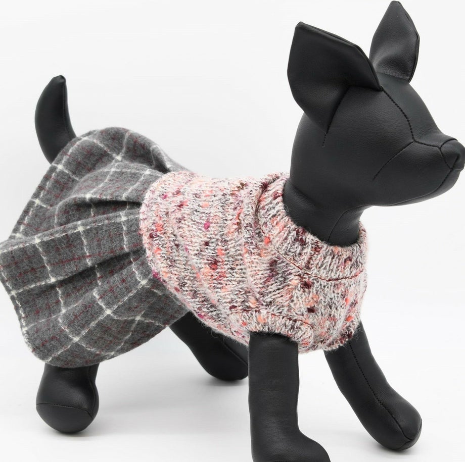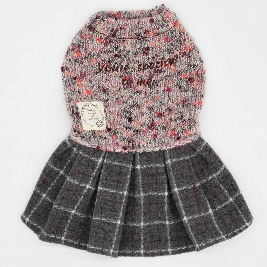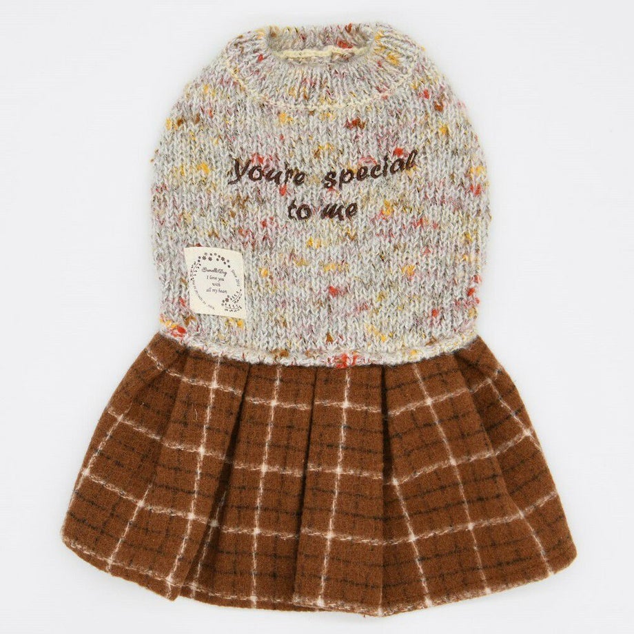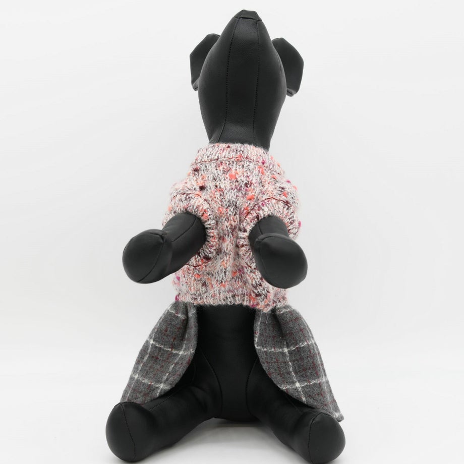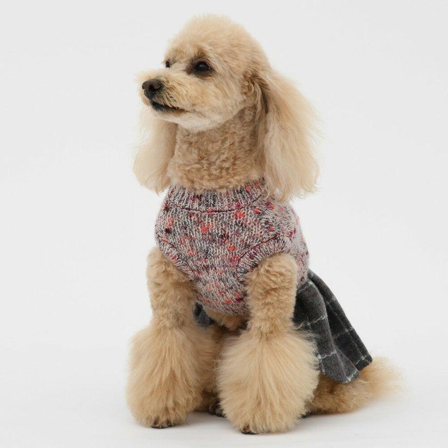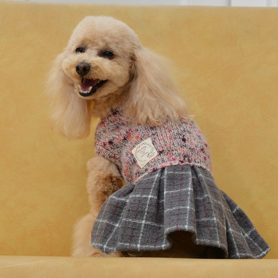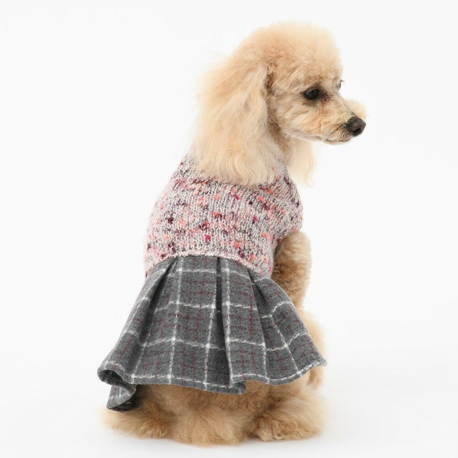 杢柄のニットとチェックのスカートがおしゃれなニットワンピース。