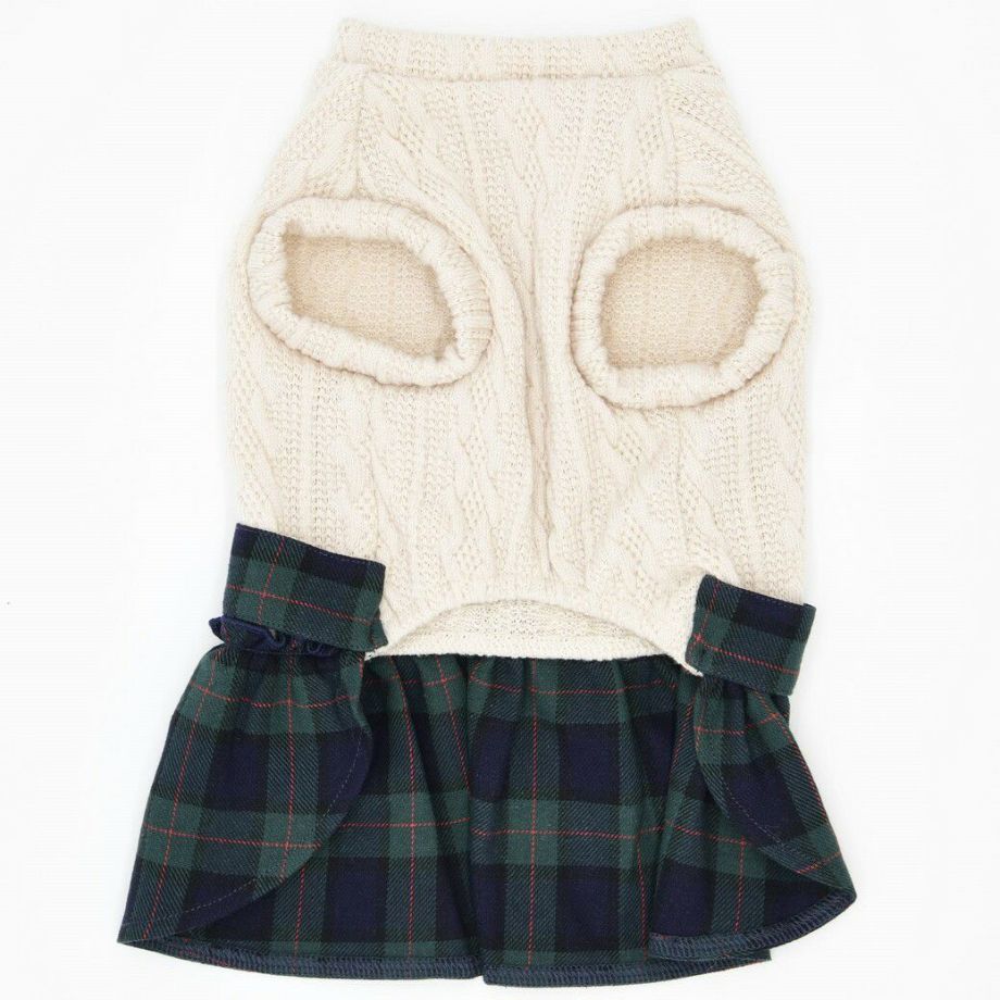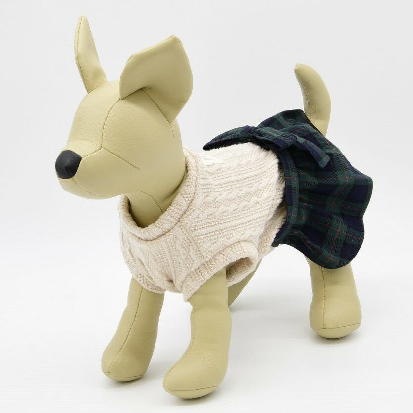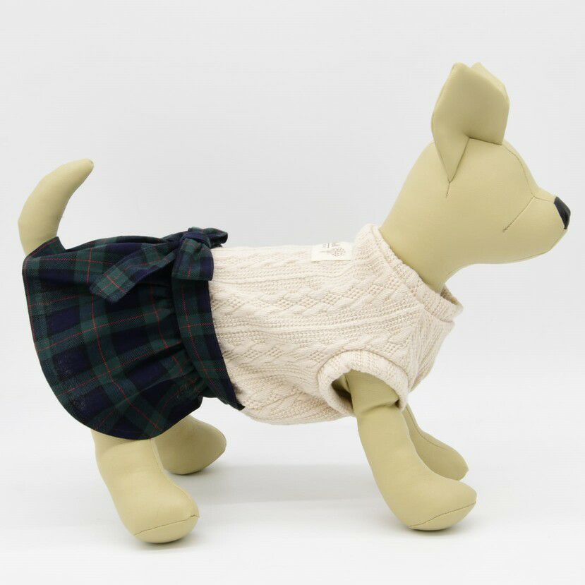 柄が主役となるチェックスカートに身頃はシンプルなデザインのケーブルニットを合わせ、バランスにこだわったウェアです。