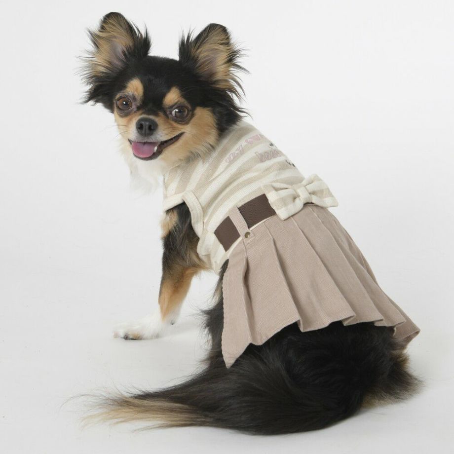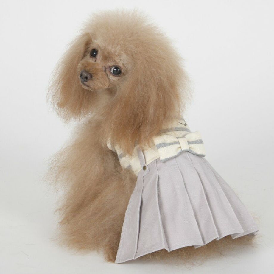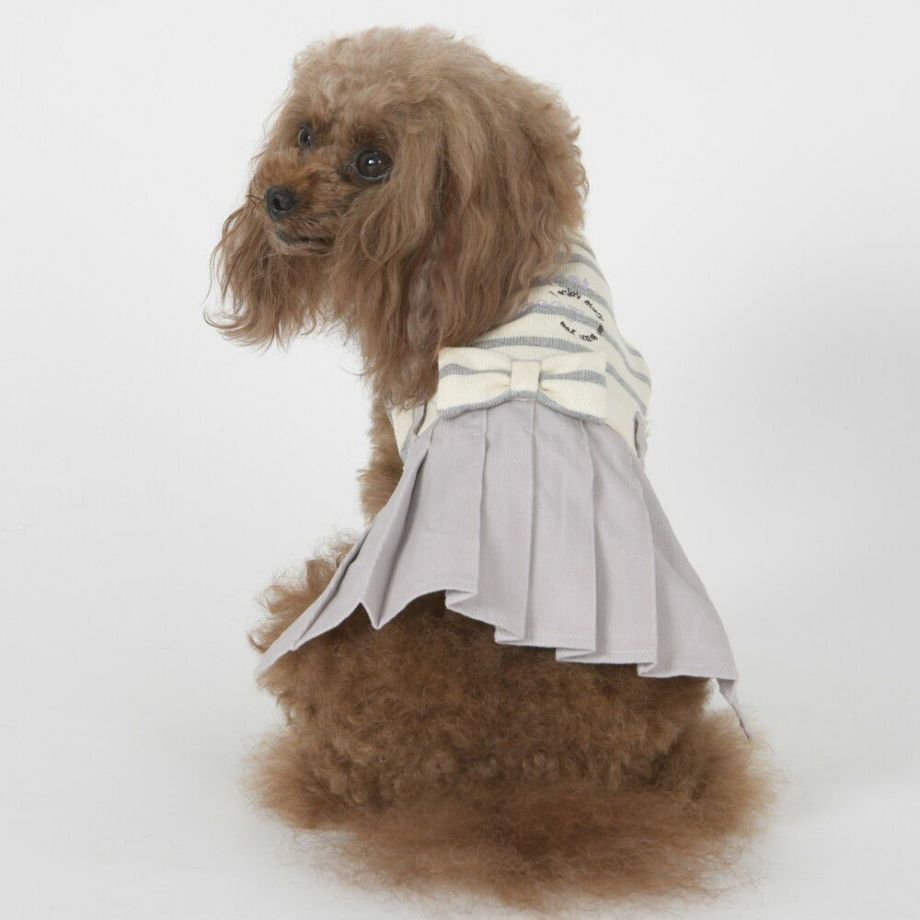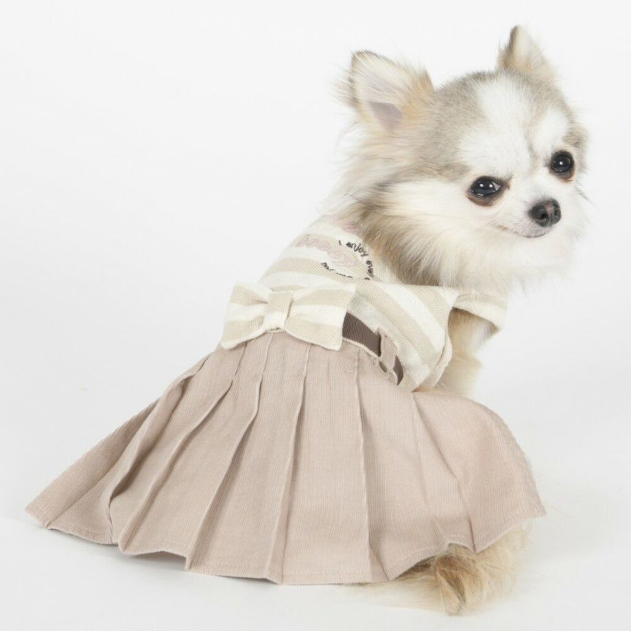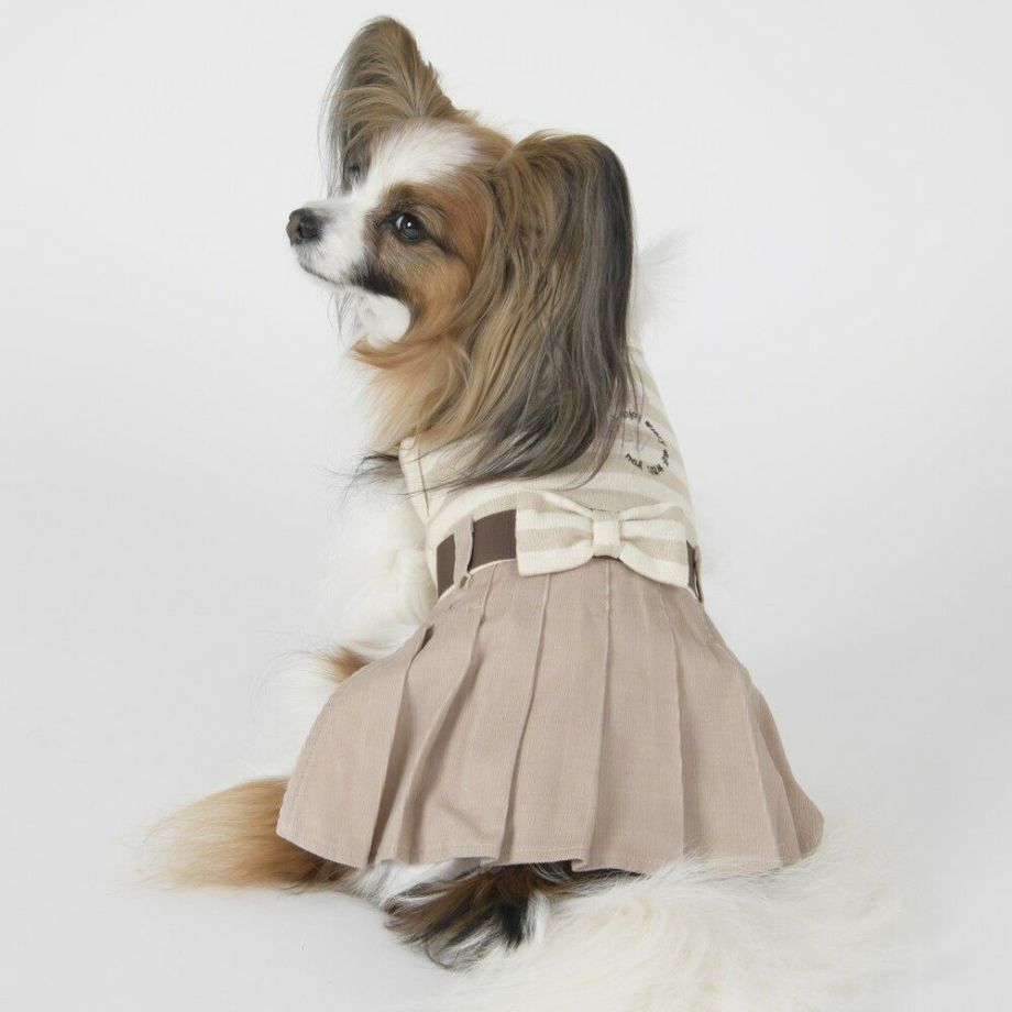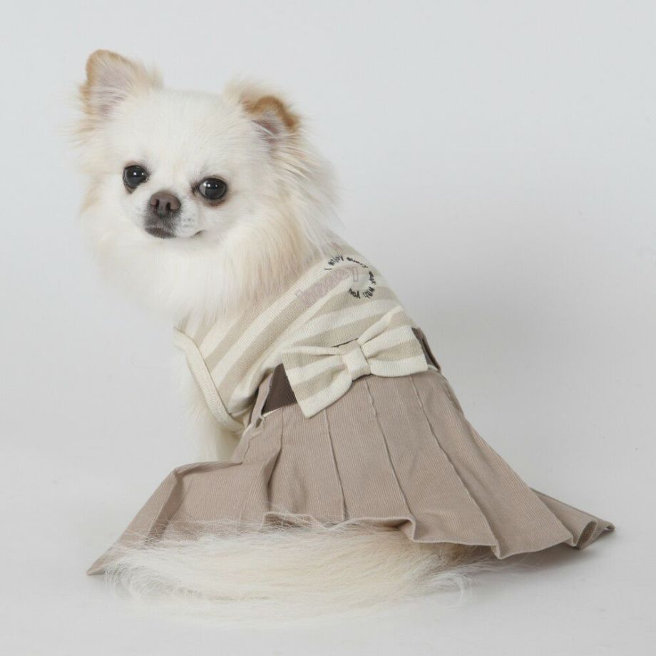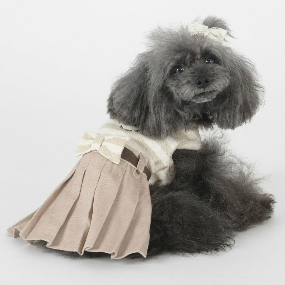 コーデュロイのプリーツ加工がおしゃれで可愛く、落ち着きがあるナチュラルカラーのボーダーを合わせる事により、シックで落ち着いた雰囲気に。