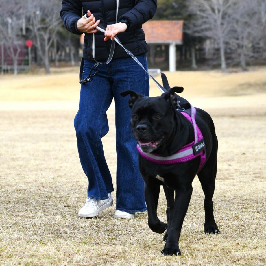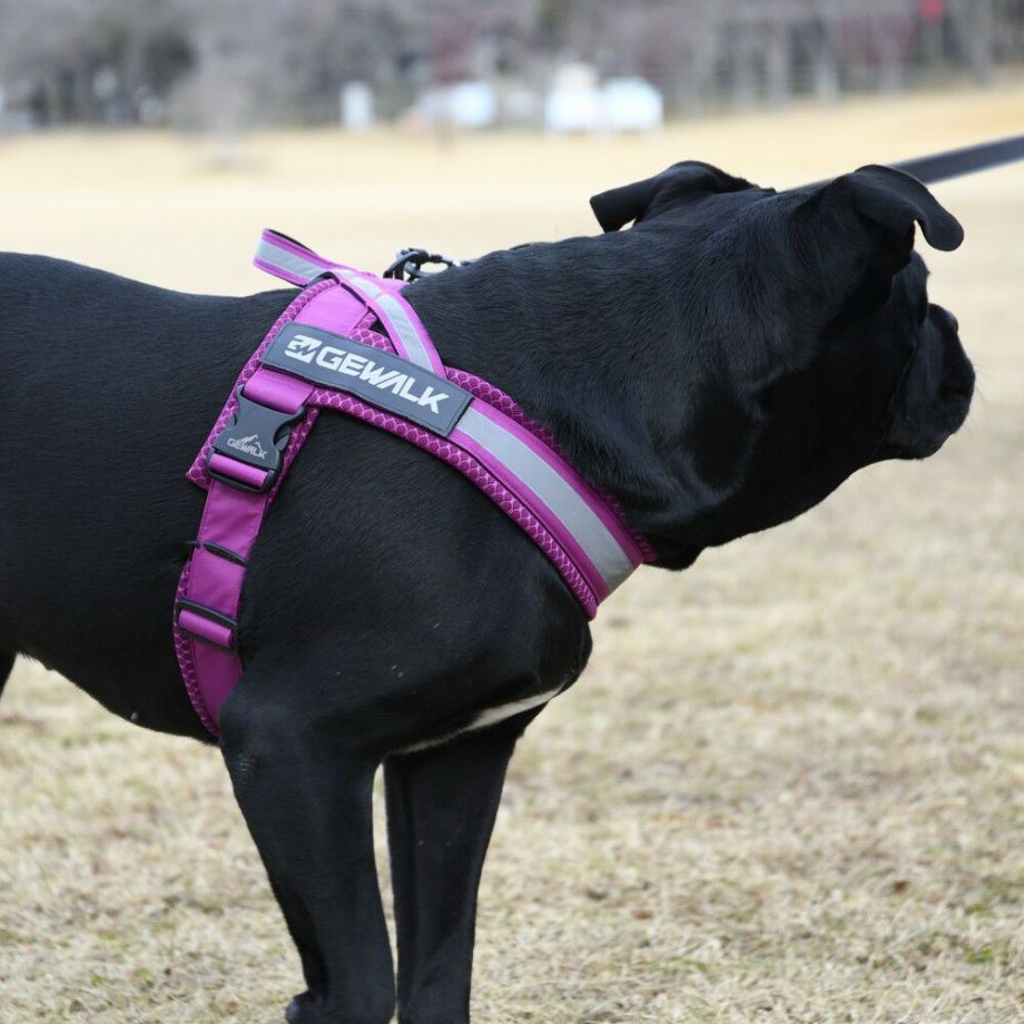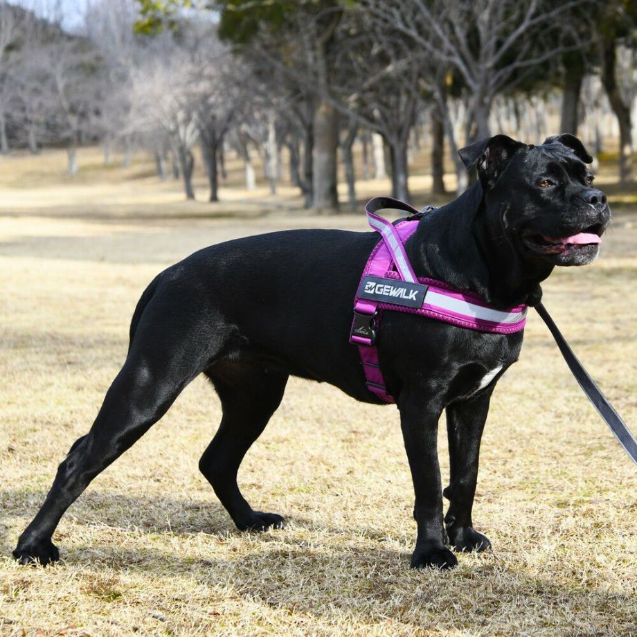T型ハーネスは、頭からかぶせて足をあげずに簡単に着脱させることができます。