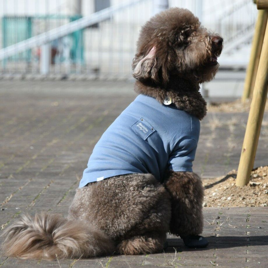 夏の散歩にもってこいのサーフライクなデニムTシャツ。胸元のワンポイントポケットが雰囲気があります。愛犬と海辺を散歩するときにもってこいのTシャツです。