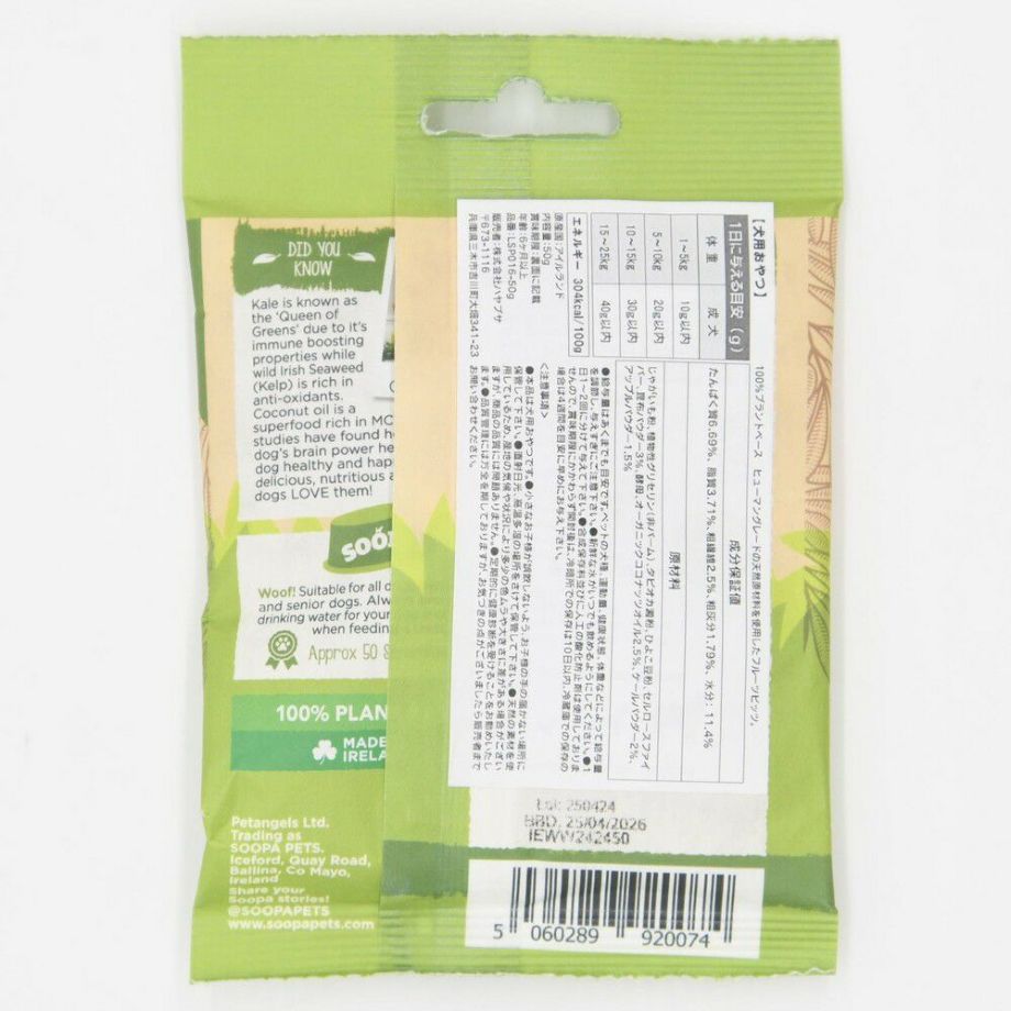 Soopaヘルシーバイツは穀物不使用、低アレルギー、ヒューマングレードの天然スーパーフード原料を使用しています。一口サイズなので、トレーニングに最適です。ポケットに入る便利なピローポーチに入っているので、外出先でもお使いいただけます!シンプルで美味しく、栄養価が高く、そして何より犬が大好きなおやつです! <ケール&アップル> ケールは、抗がん作用や免疫力を高める作用があるため、「緑の女王」として知られています。抗酸化物質、鉄分、カルシウム、重要なビタミンを含むケールは、愛犬にとって栄養の宝庫でもあります。ケルプは地球上で最も栄養豊富な食材のひとつで、愛犬の皮膚、被毛、爪、歯をサポートし、愛犬の健康維持に役立ちます。