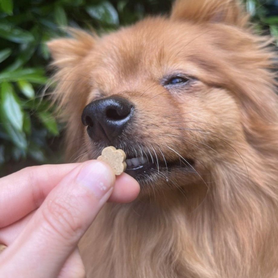 ポケットに入る便利なピローポーチに入っているので、外出先でもお使いいただけます!シンプルで美味しく、栄養価が高く、そして何より犬が大好きなおやつです!