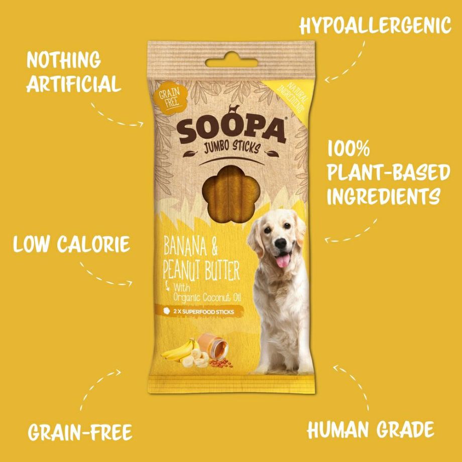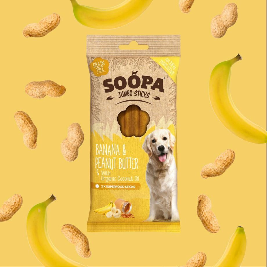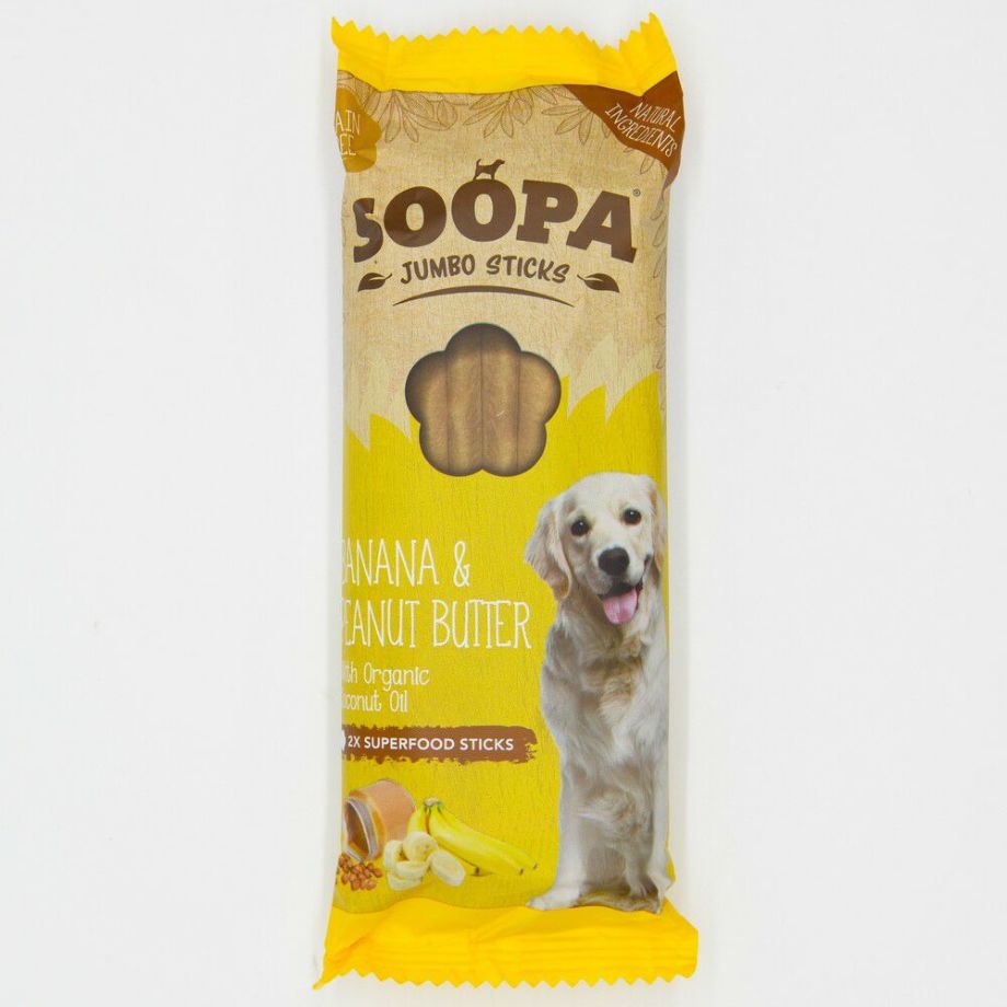 味もサイズもたっぷりの健康的な犬用おやつ SOOPA バナナ アンド ピーナッツバター ジャンボ スティック