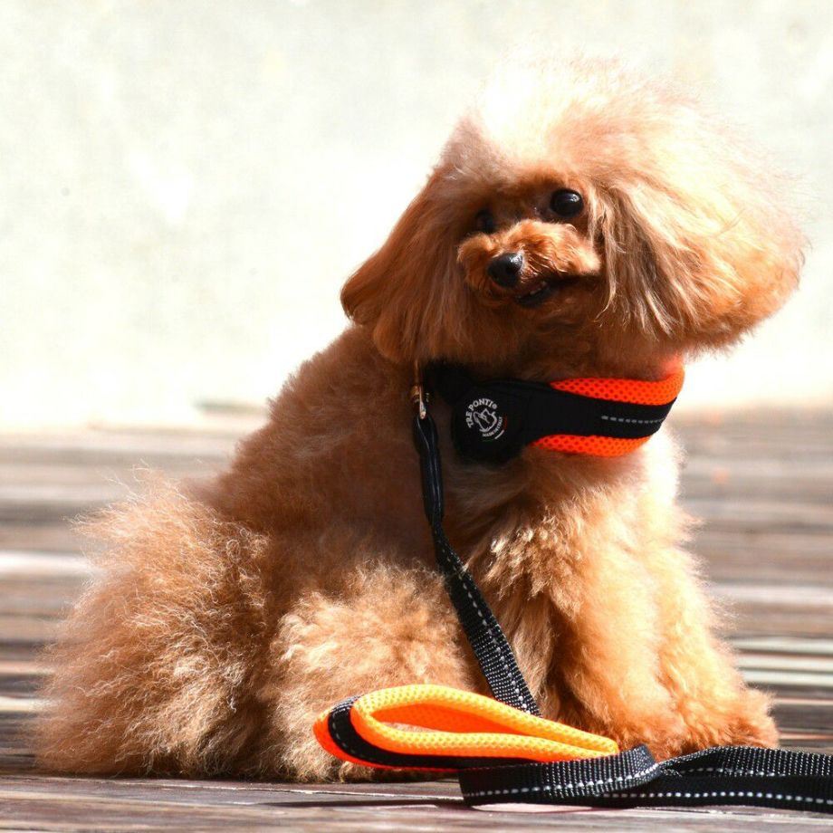 胴回りの部分が調節可能なハーネス。柔らかいメッシュ生地を使用した、負担になりにくい設計でビビットなカラーが目を引きます。