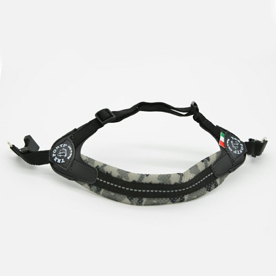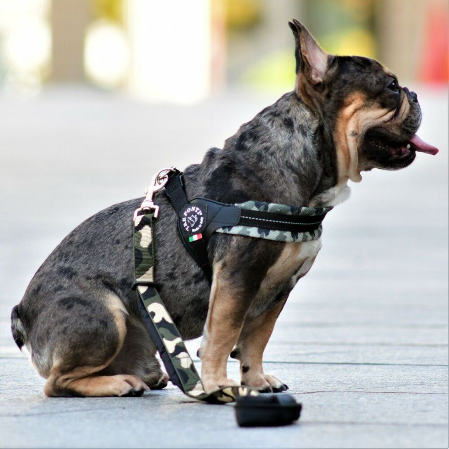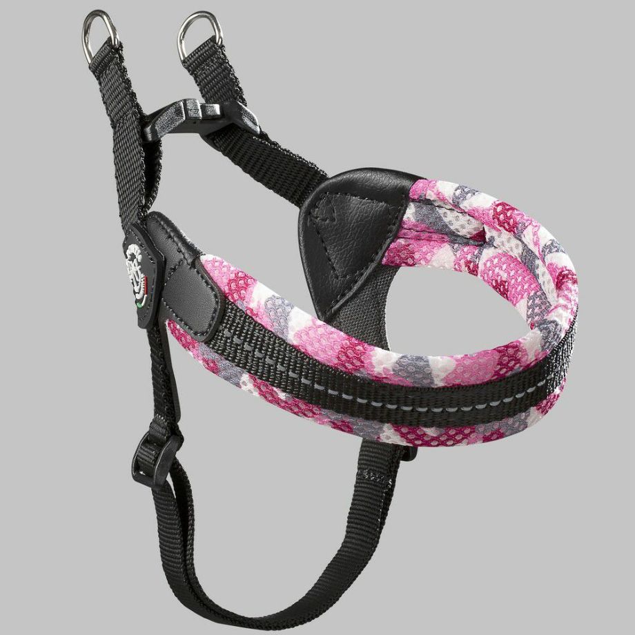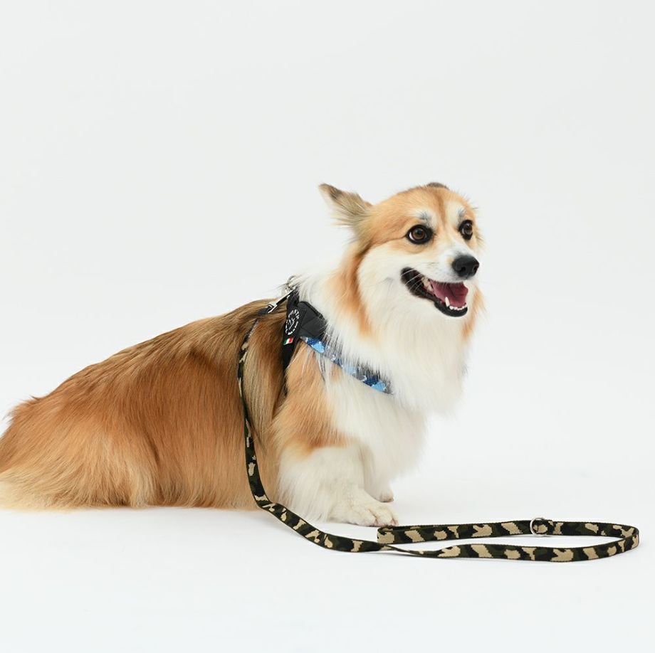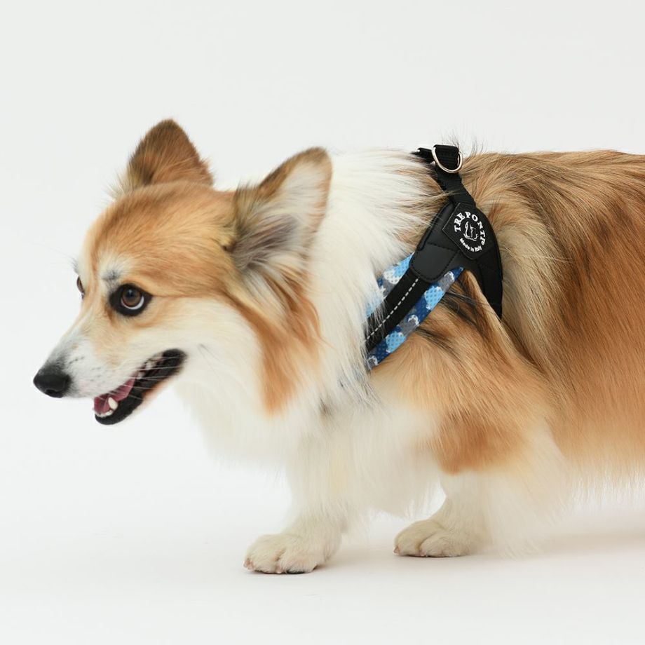 胴回りの部分が調節可能なハーネス。柔らかいメッシュ生地を使用した負担になりにくい設計で、迷彩柄が個性を引き立てます。