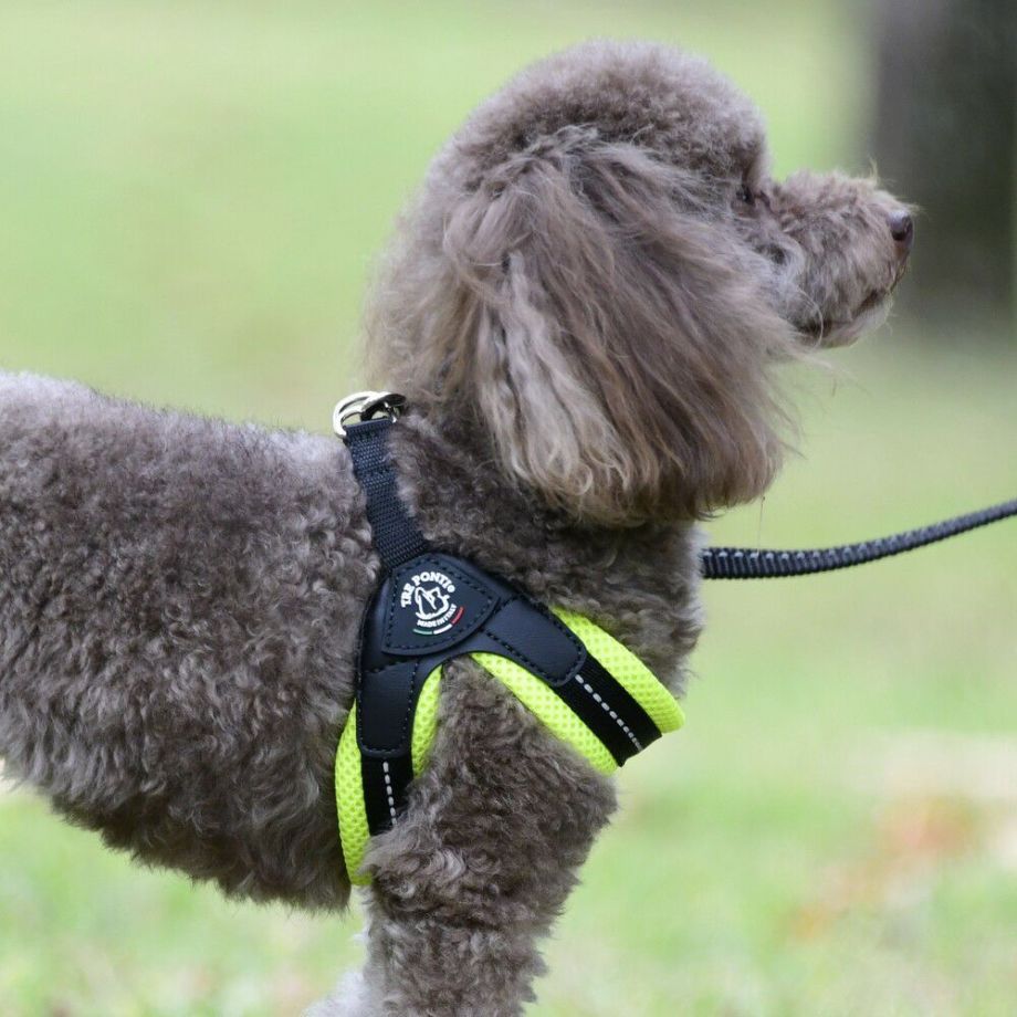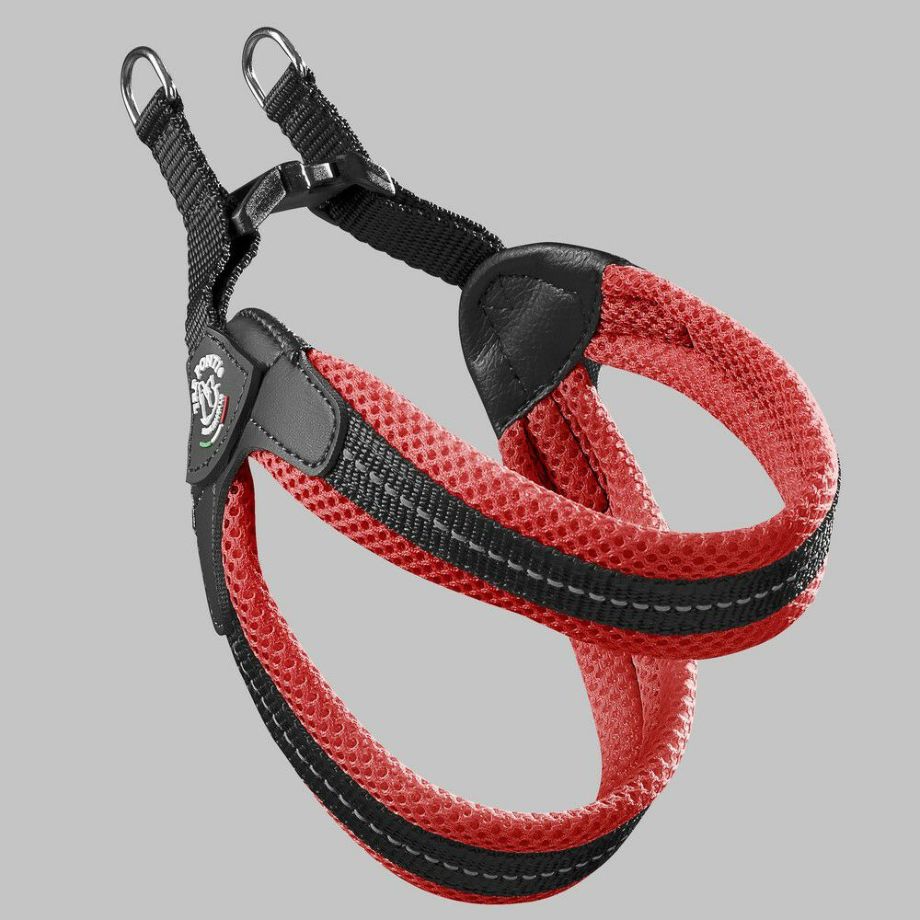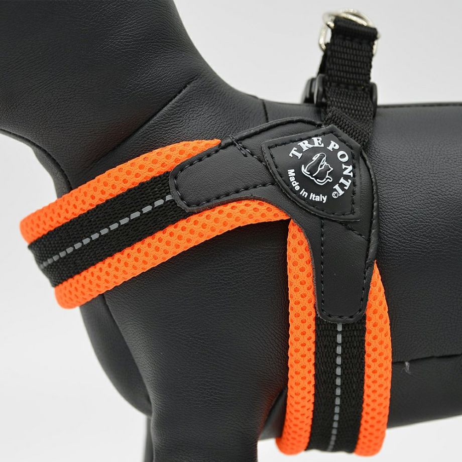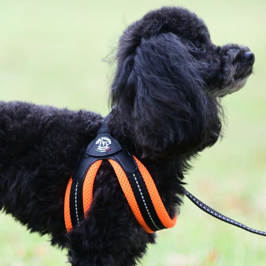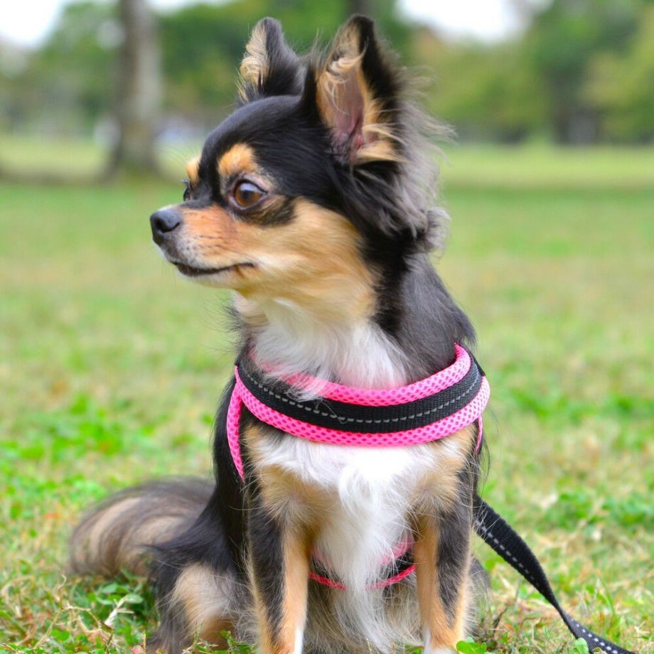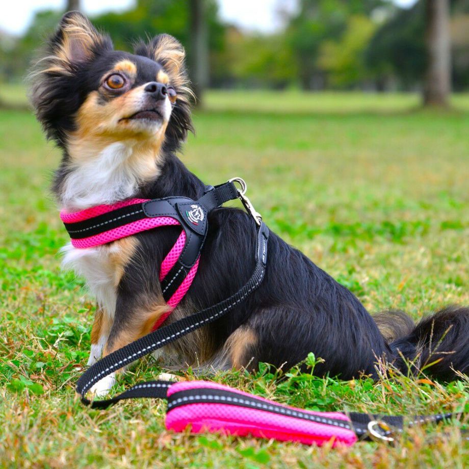 簡単に着脱可能なハーネス。柔らかいメッシュ生地を使用した負担になりにくい設計で、ビビットなカラーが目を引きます。