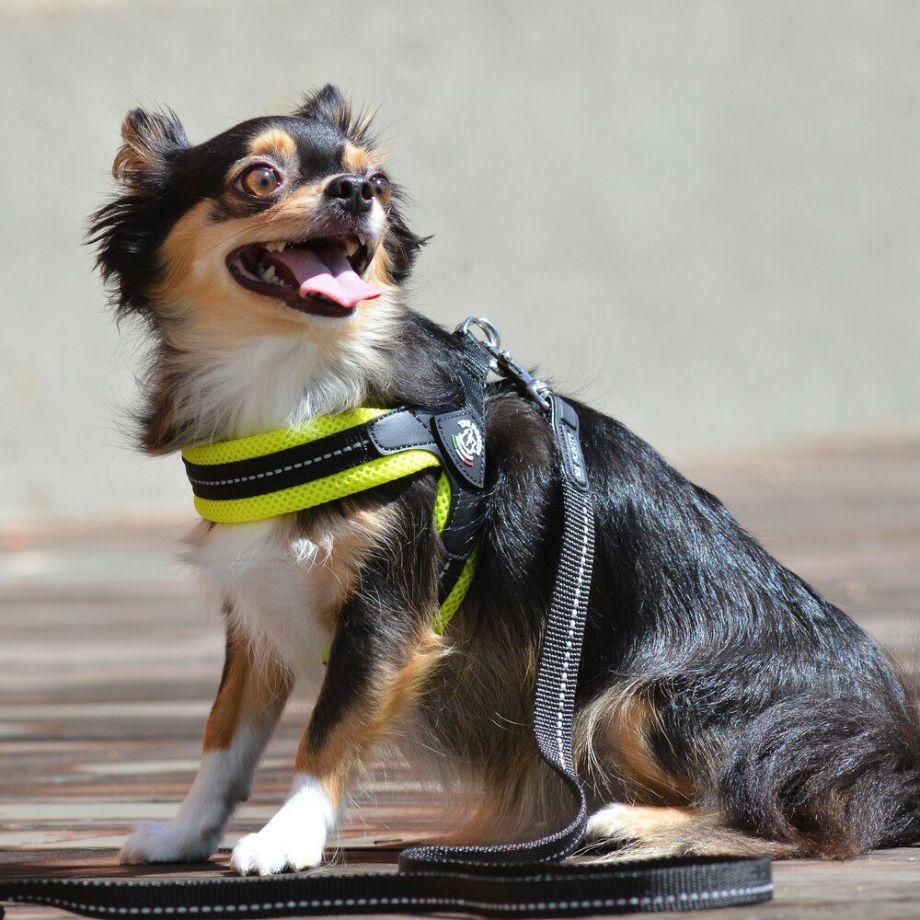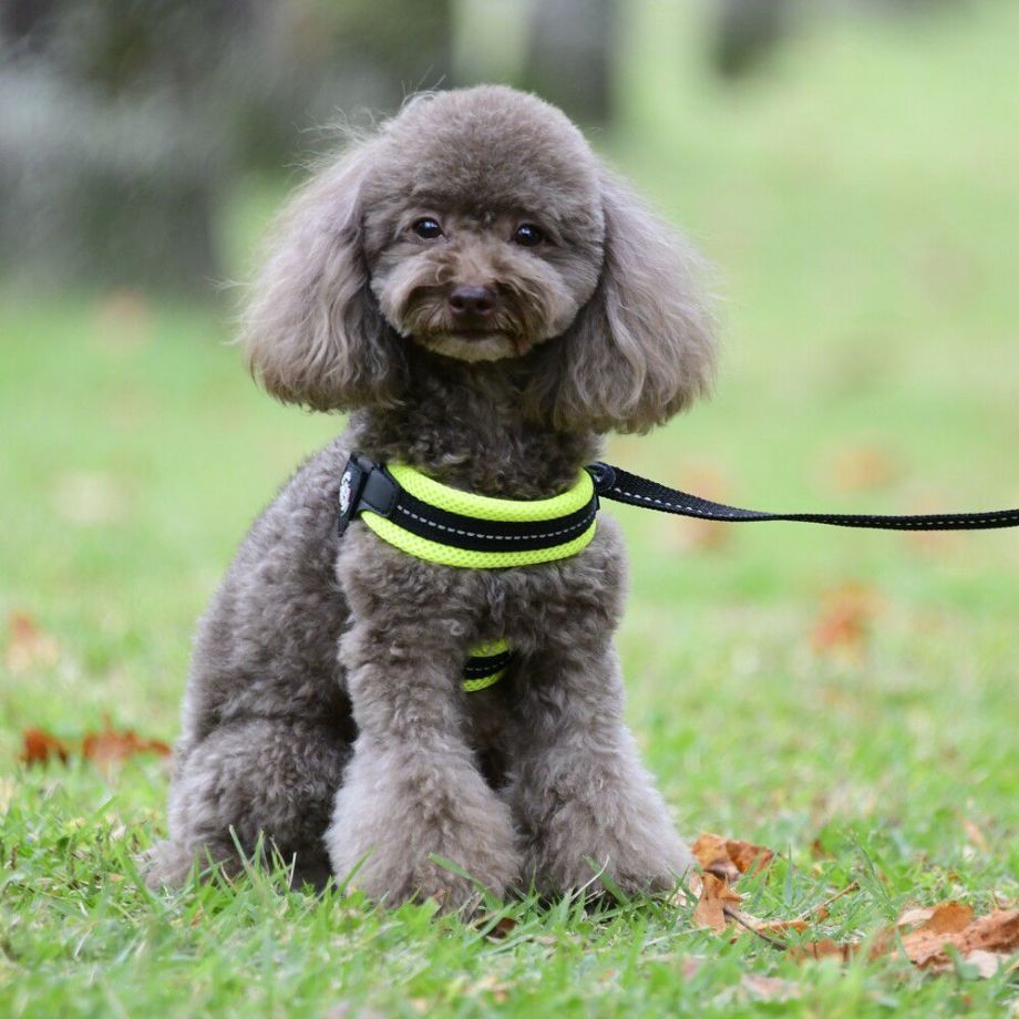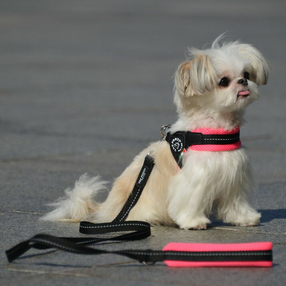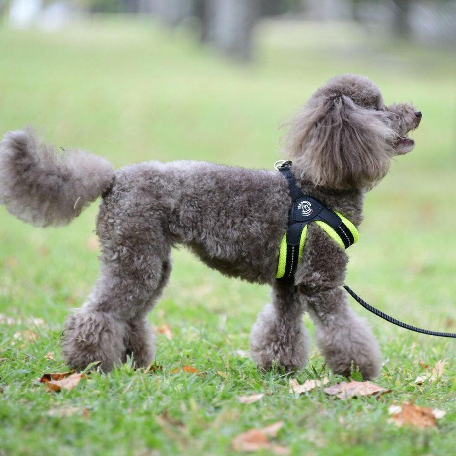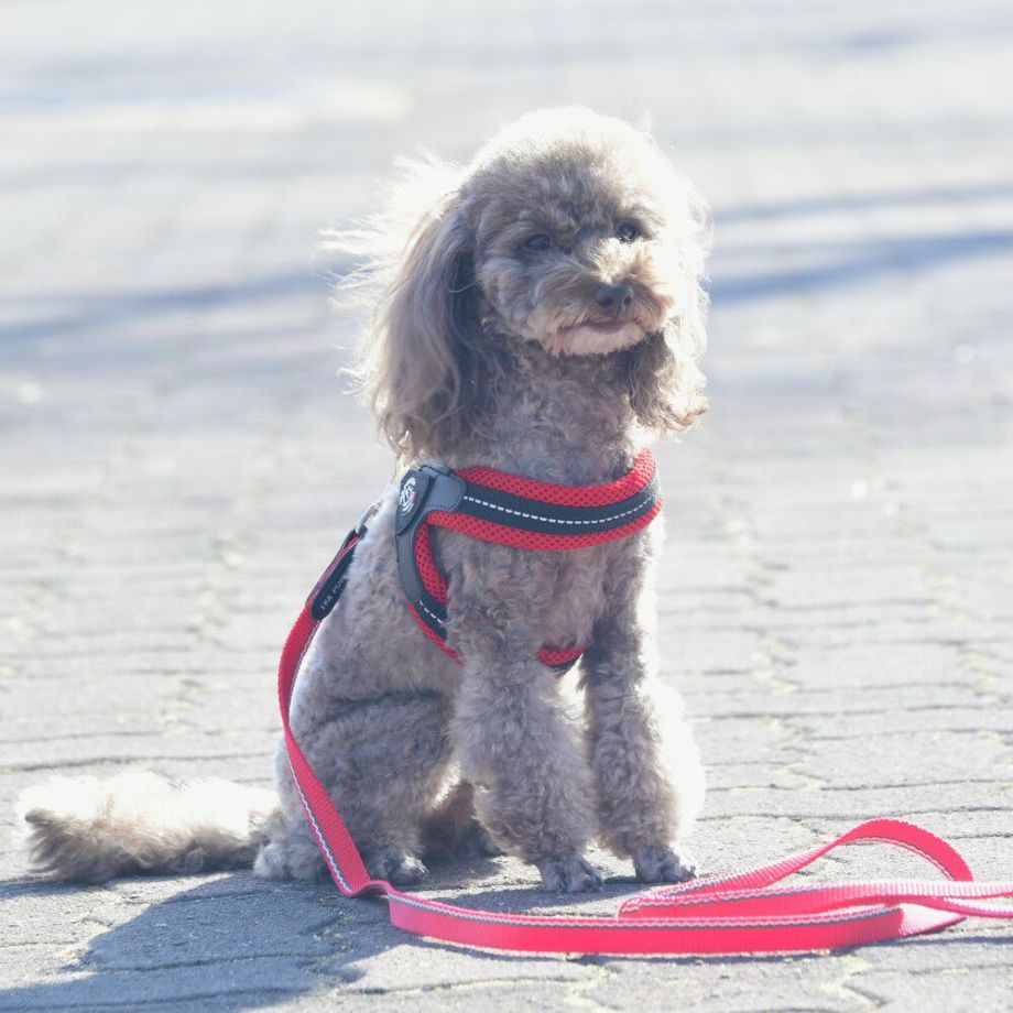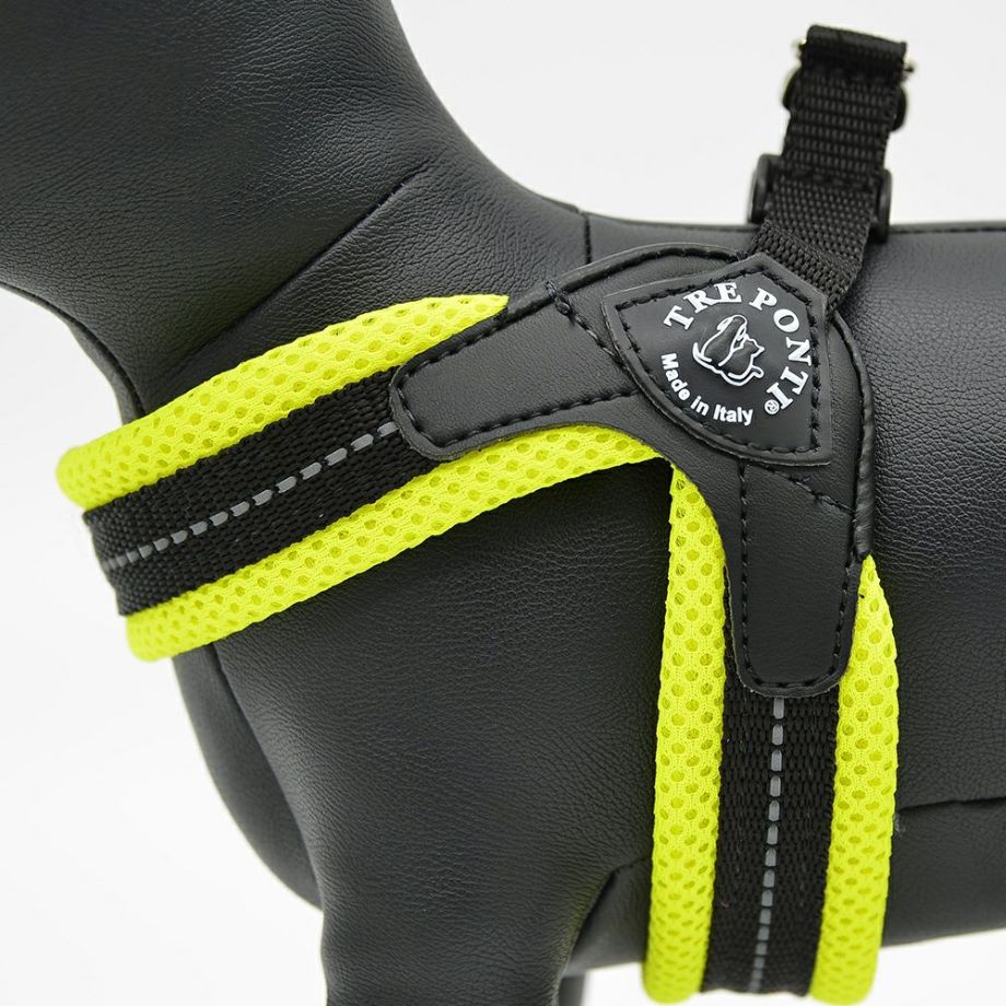 簡単に着脱可能なハーネス。柔らかいメッシュ生地を使用した負担になりにくい設計で、ビビットなカラーが目を引きます。