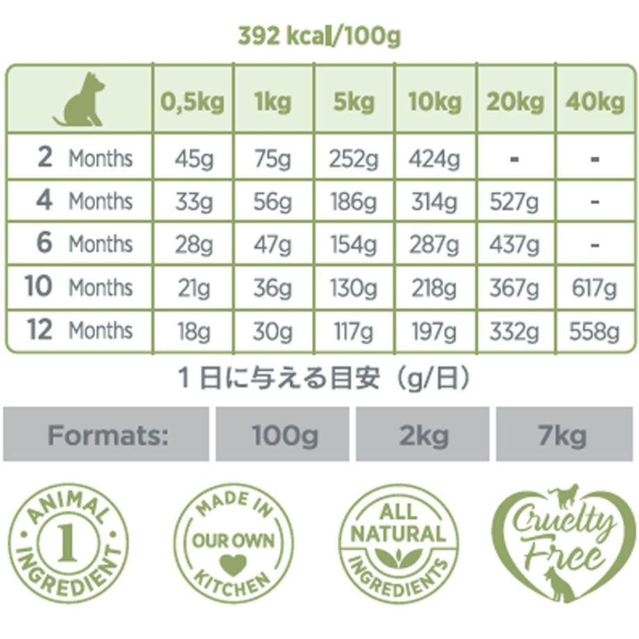 新鮮なウサギ肉のみを唯一の動物性原料として調理されたドライフードで、脂肪とコレステロールが少なく、子犬の健康的な成長に不可欠なタンパク質とミネラルが豊富に含んでいます。