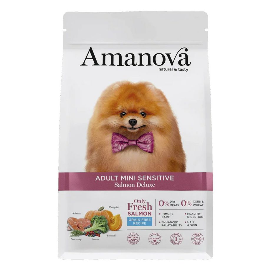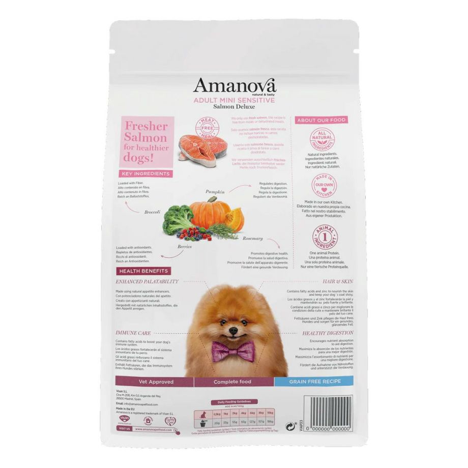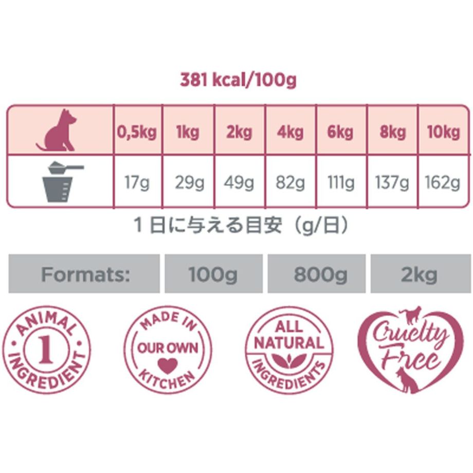 サーモンを使用した、小型犬、特に新鮮なサーモンを使用し、皮膚や消化に配慮して設計された、小型犬向けのグレインフリー小粒フードです。