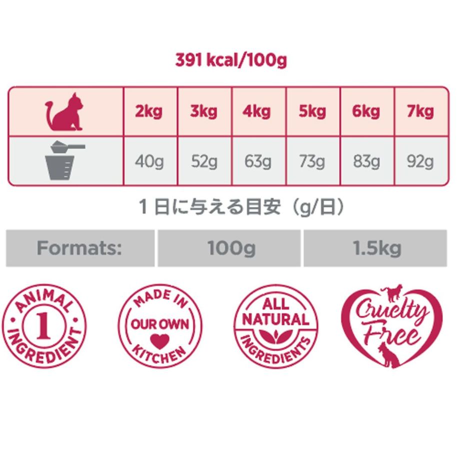 たんぱく質31.5%、脂質18.0%、粗繊維3.25%、粗灰分8.0%、水分8.0%、オメガ3脂肪酸0.30%、オメガ6脂肪酸2.45%、カルシウム1.3%、リン1.05%