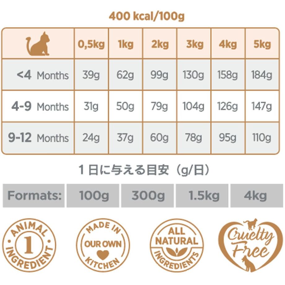 子猫の腎臓と消化器系の健康に配慮し、ウサギ肉のみを使用したローグレイン・高タンパク質・低脂質の、子猫向けの上質なフードです。