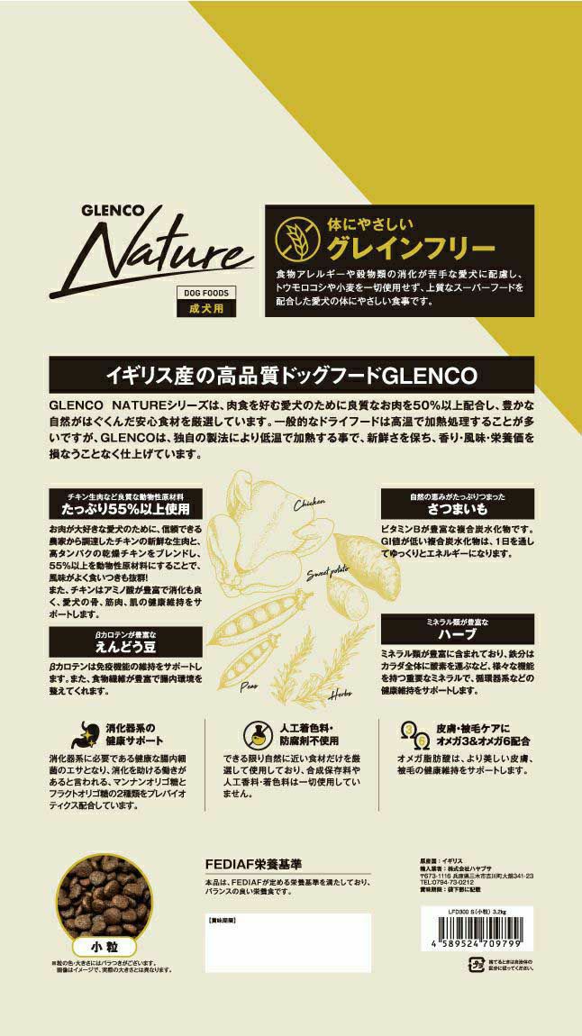 一般的なドライフードは高温で加熱処理をすることが多いですが、GLENCOは、独自の製法により低温で加熱する事で、新鮮さを保ち、香り・風味・栄養価をそこなうことなく仕上げています。