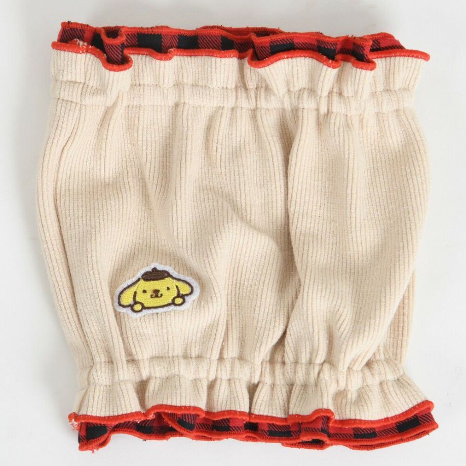 伸縮性のあるリブ生地です。可愛いポムポムプリンのワッペンを付けました。お腹の冷え対策とスヌードとしても使用できる商品です。