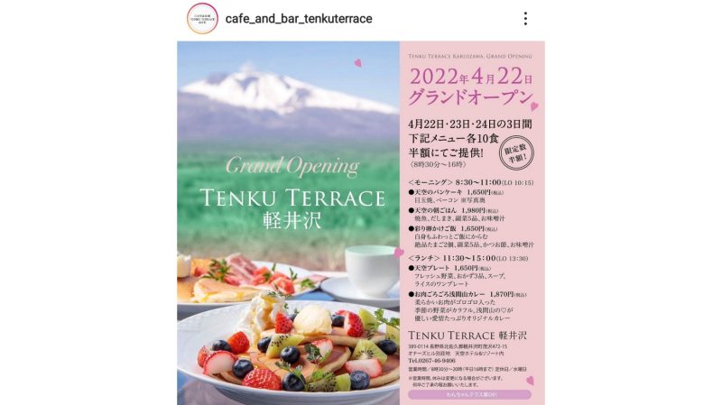 そして、ニューオープンのお店とは、「TENKU TERRACE」(軽井沢町茂沢472-15、0267-46-9406、@cafe_and_bar_tenkuterrace)というお店で、「カフェ&リゾート ディレタント」(@cafe_and_resort_dirlettant)さんの姉妹店で,4月22日にグランドオープンされます。