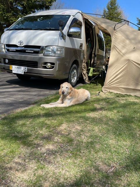 風がまだ冷たかったですが、ここのキャンプ場のサイトは広く大型犬と遊ぶスペースたっぷりです。