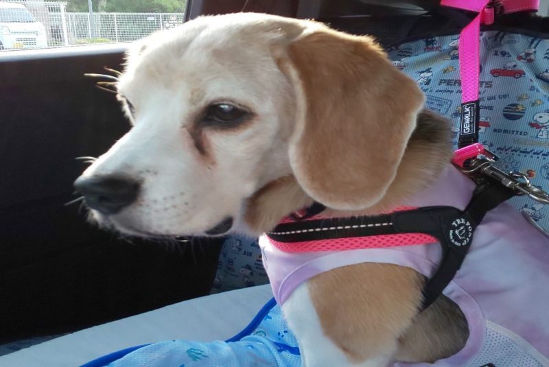 ハーネスをつけて家の周りを少し散歩したり、車でお出掛けをするときにもハーネスは、大活躍しています。