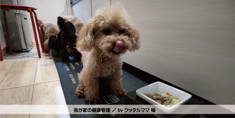 我が家の食べさせ方は、水分をタップリ摂らせたいので、ドライフード(ローテーションありです)に手作りの「野菜入り軟骨スープ」(たくさん炊いて冷凍保存で手抜きができます)をかけています。