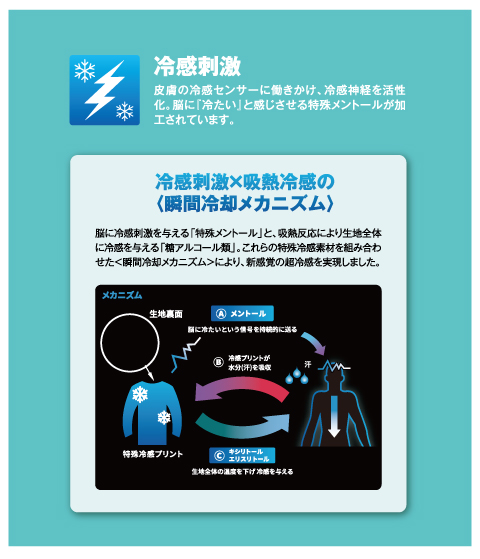 脳に冷感刺激を与える「特殊メントール」と、吸熱反応により生地全体に冷感を与える「糖アルコール類」。