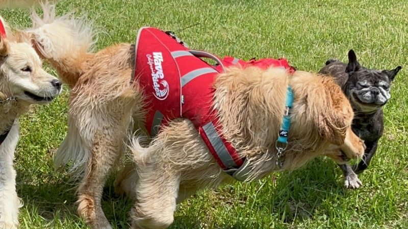 泳ぎに自信のあるジーニーですが、奥の方は深みがあり、ここではGEWALKのウェーブライダーを着用しています。これを着せていると安心して自由に遊ばせてあげれるので、愛用しています!