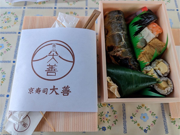 京寿司嵐山『大善』さんの季節のお寿司をまえもって予約しており、乗船前に引き取ってきました。