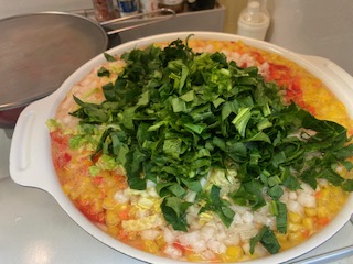 水炊きの鍋の感覚です。大きな鍋にカットした昆布を入れて材料を