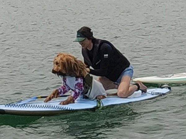 実際に愛犬とSUP体験。浅瀬にてSUPのコントロールだけでなく、愛犬とのSUPに慣れていただきます。