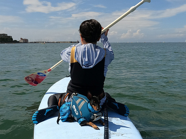 実際に愛犬とSUP体験。浅瀬にてSUPのコントロールだけでなく、愛犬とのSUPに慣れていただきます。