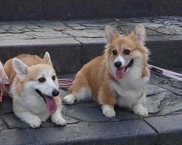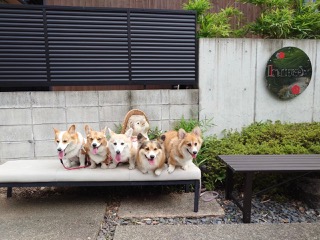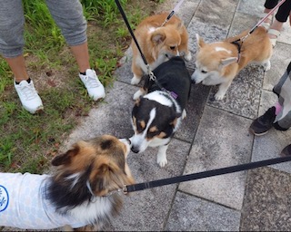 お散歩中のブラックヘッドのコーギーちゃんにみんなでご挨拶。