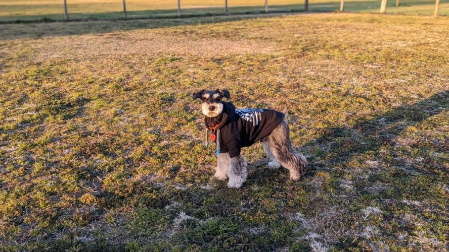朝の散歩はGEWALKドリズルサーマルオーバーオールを着て、寒がりなジジも暖かそうに過ごしていました。