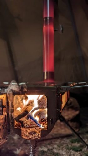※テント内での薪ストーブ利用は一酸化炭素中毒などリスクがあるので、十分注意(換気、一酸化炭素中毒センサー利用など)して取り扱いください。