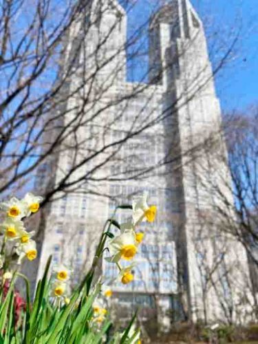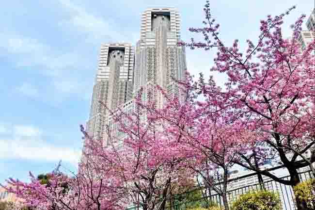 公園の南東部にある多目的運動広場の入口に植えられている河津桜が調度見ごろを迎えています。見慣れている都庁も、河津桜ごしに見ると、オツに感じます。